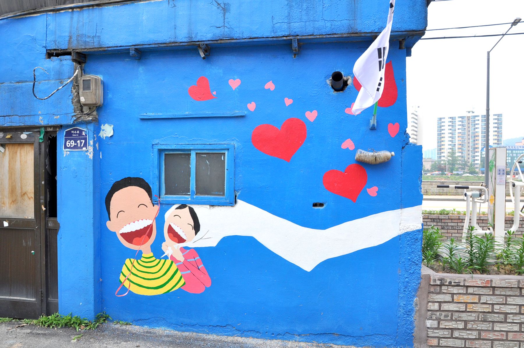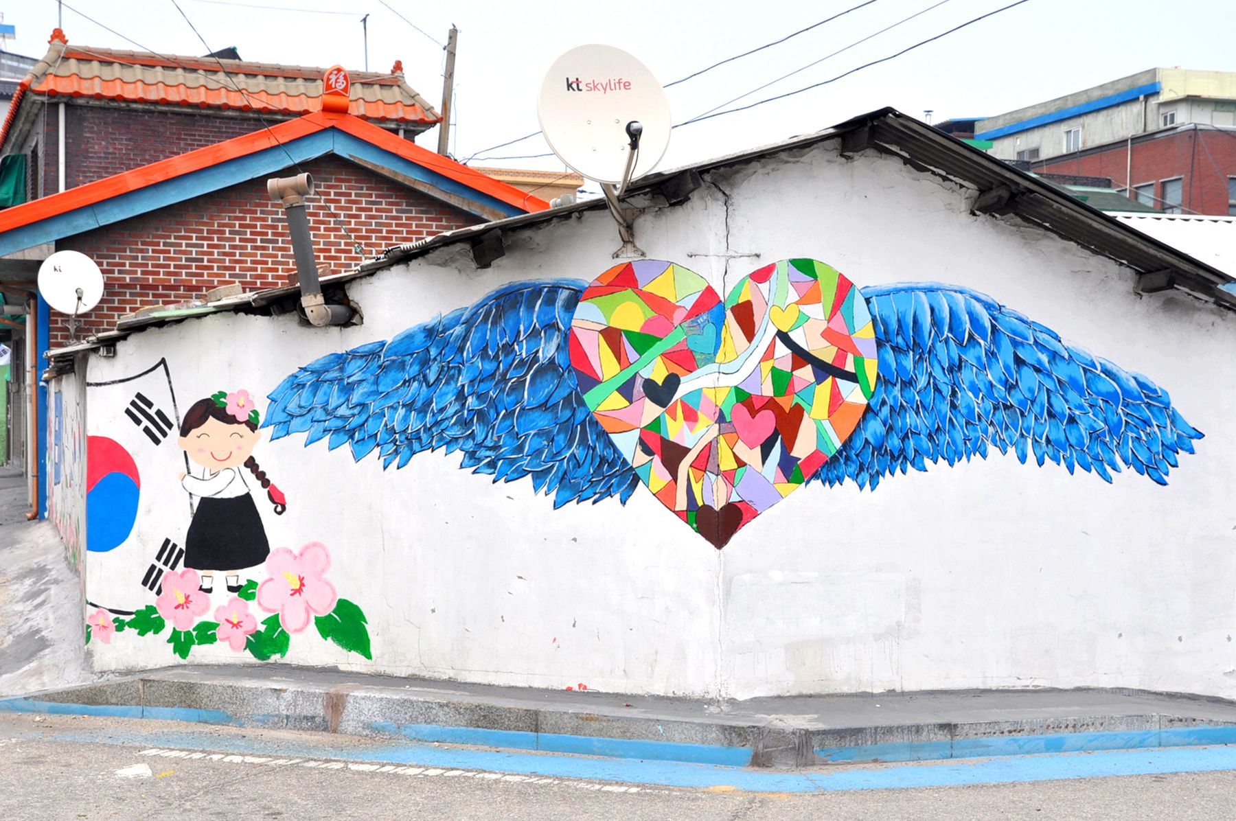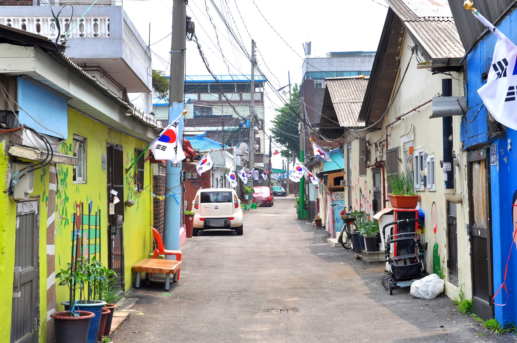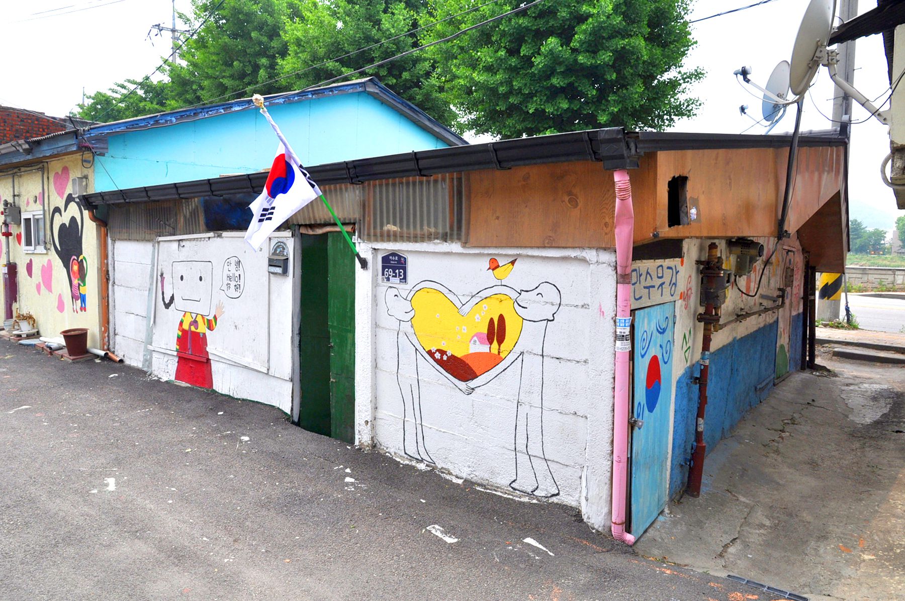 활기찬 동네로의 탈바꿈을 위해 조성한 동두천 태극기벽화마을은 어두운 이미지에서 벗어나 밝은 분위기를 주고 있습니다.