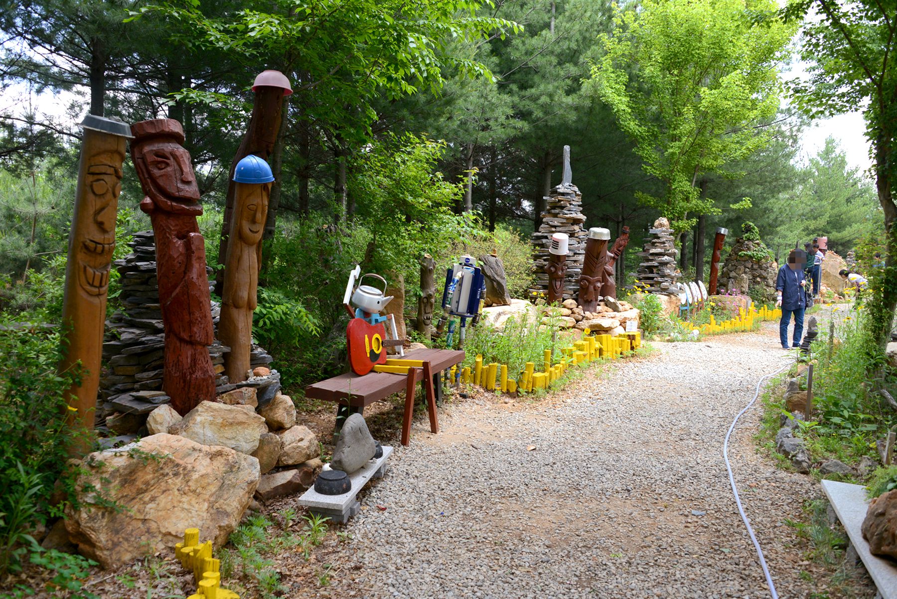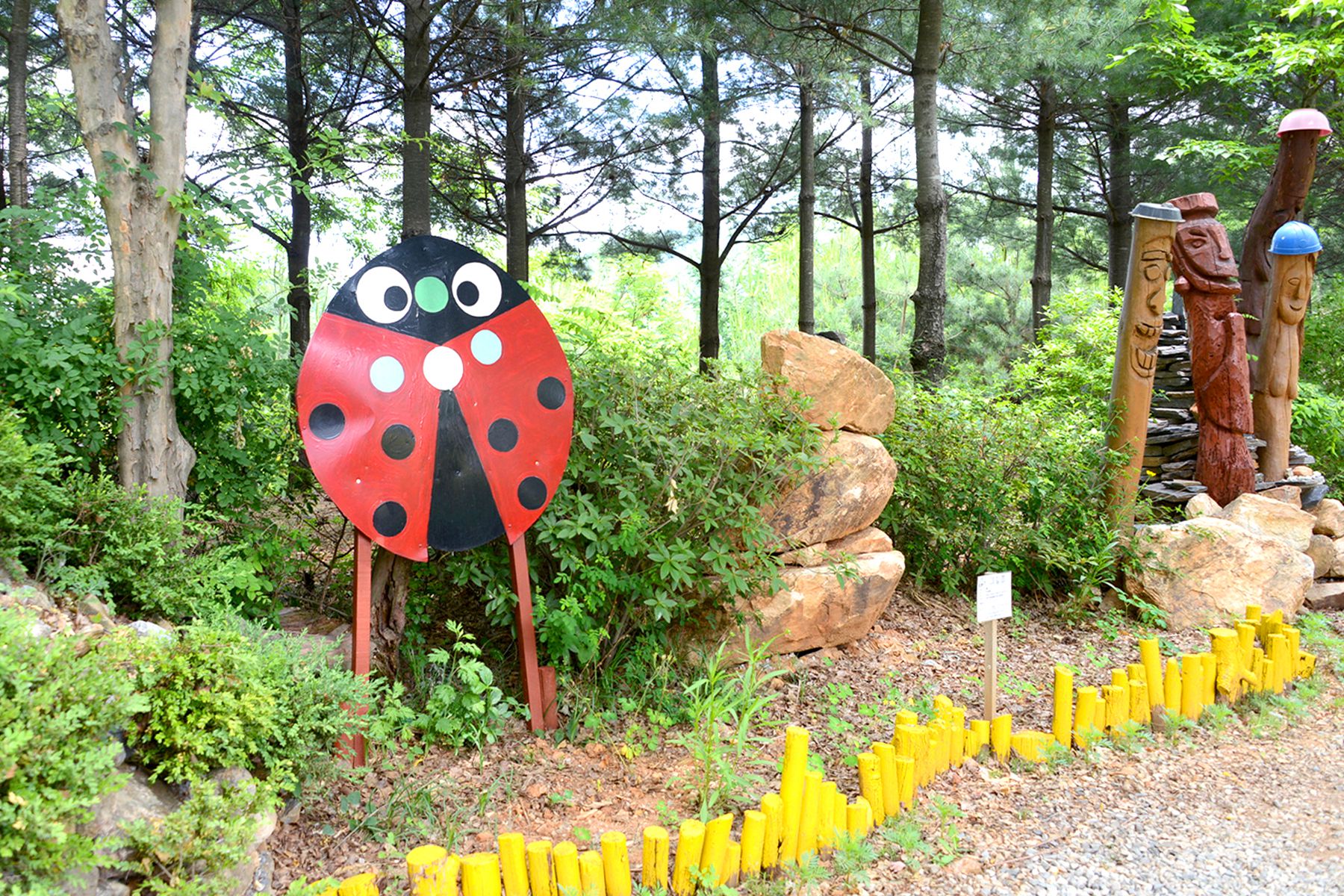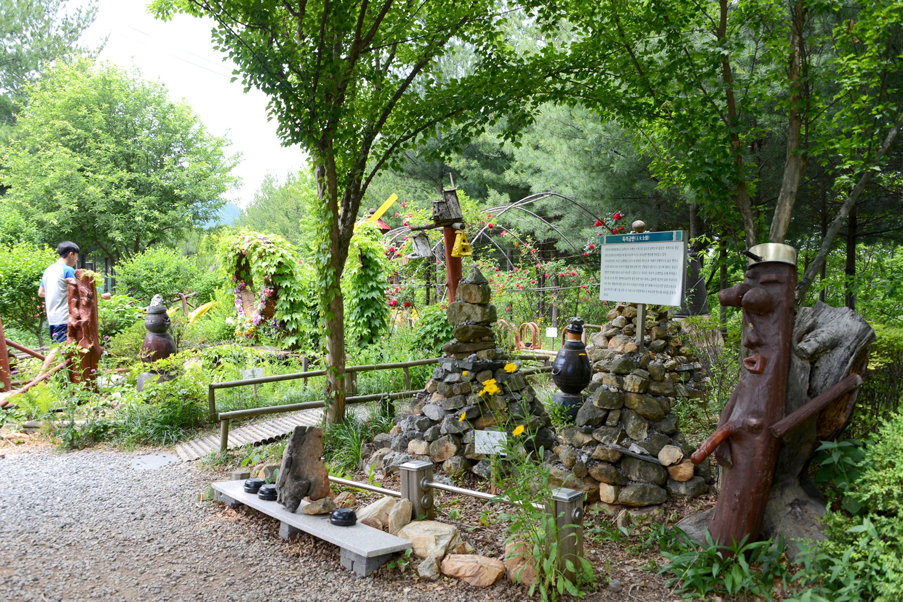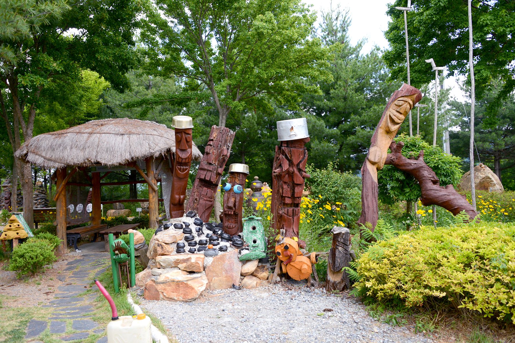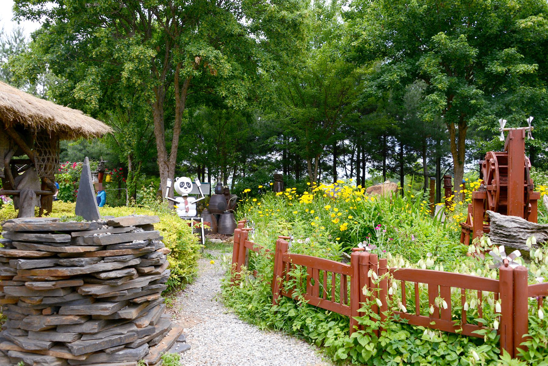 많이 넓진 않지만 형형색색의 야생화 등으로 작은 숲을 꾸며놓았고, 나무조형물, 인형 등을 배치해놓아 아기자기한 느낌을 주고 있답니다.