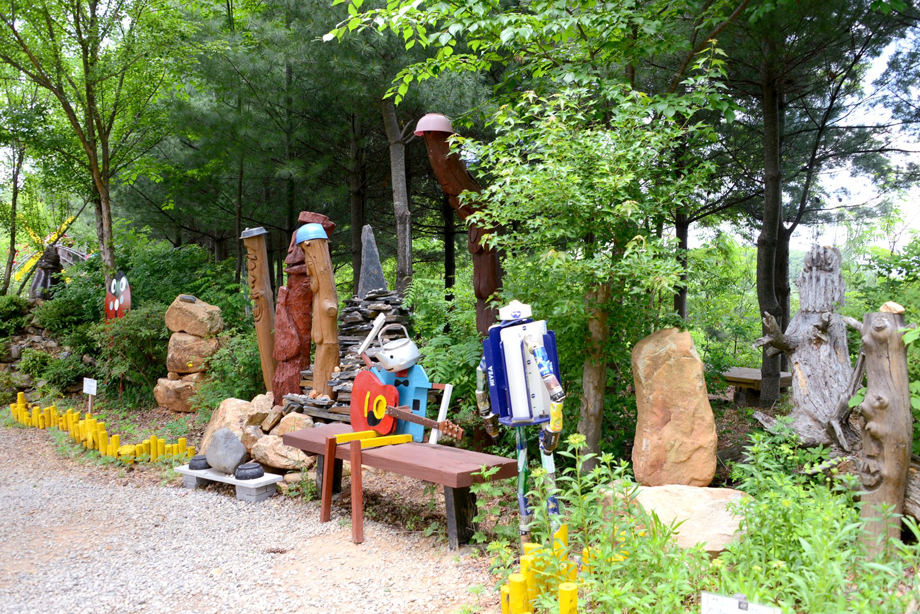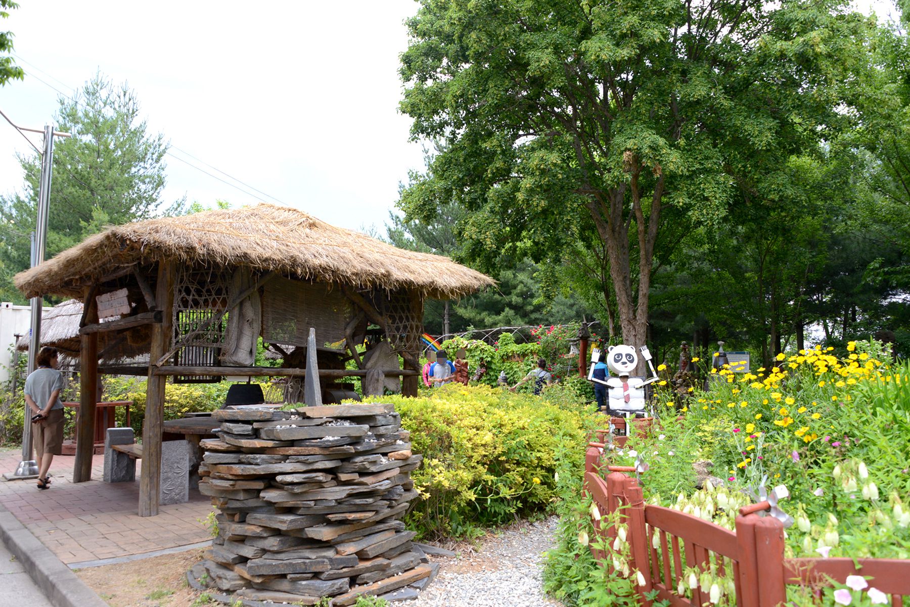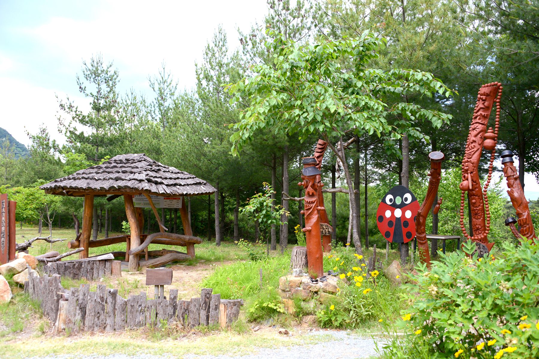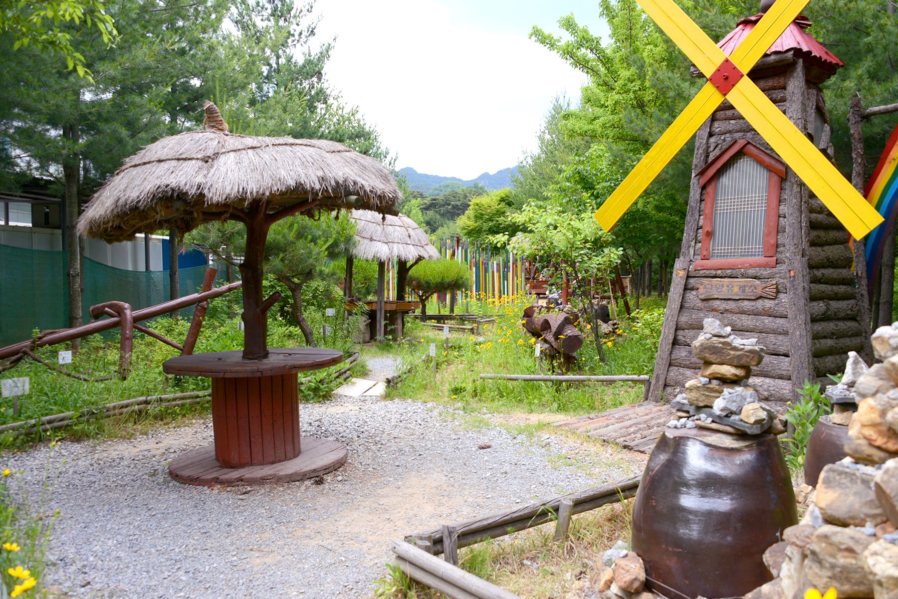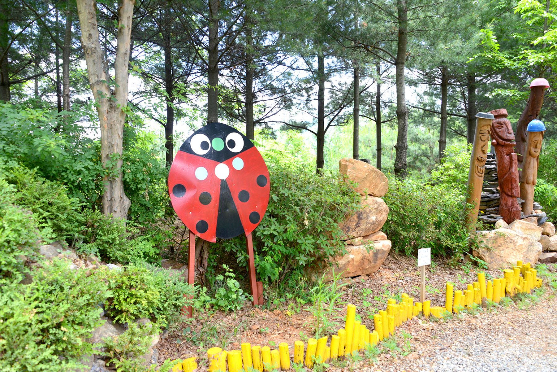 많이 넓진 않지만 형형색색의 야생화 등으로 작은 숲을 꾸며놓았고, 나무조형물, 인형 등을 배치해놓아 아기자기한 느낌을 주고 있답니다.