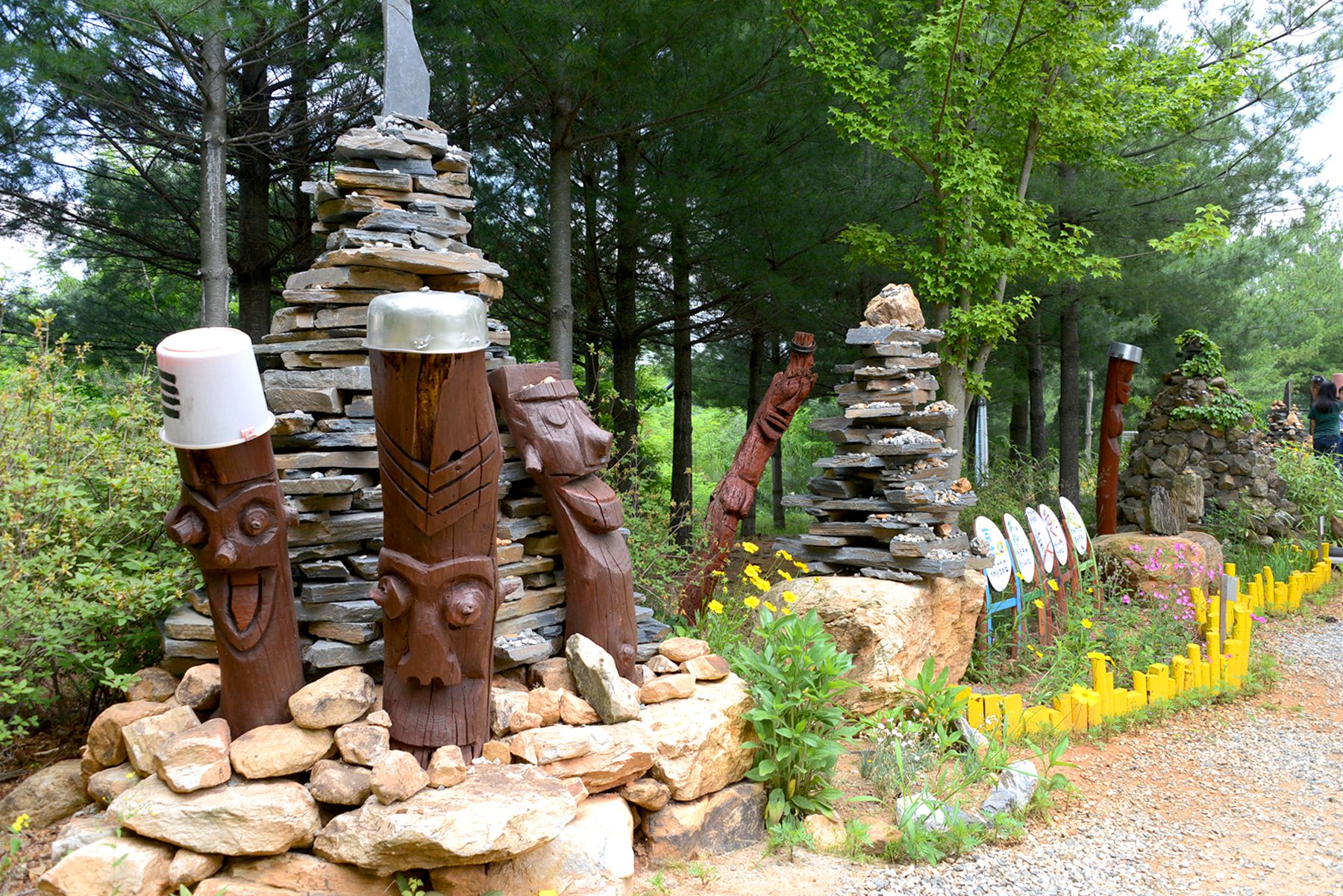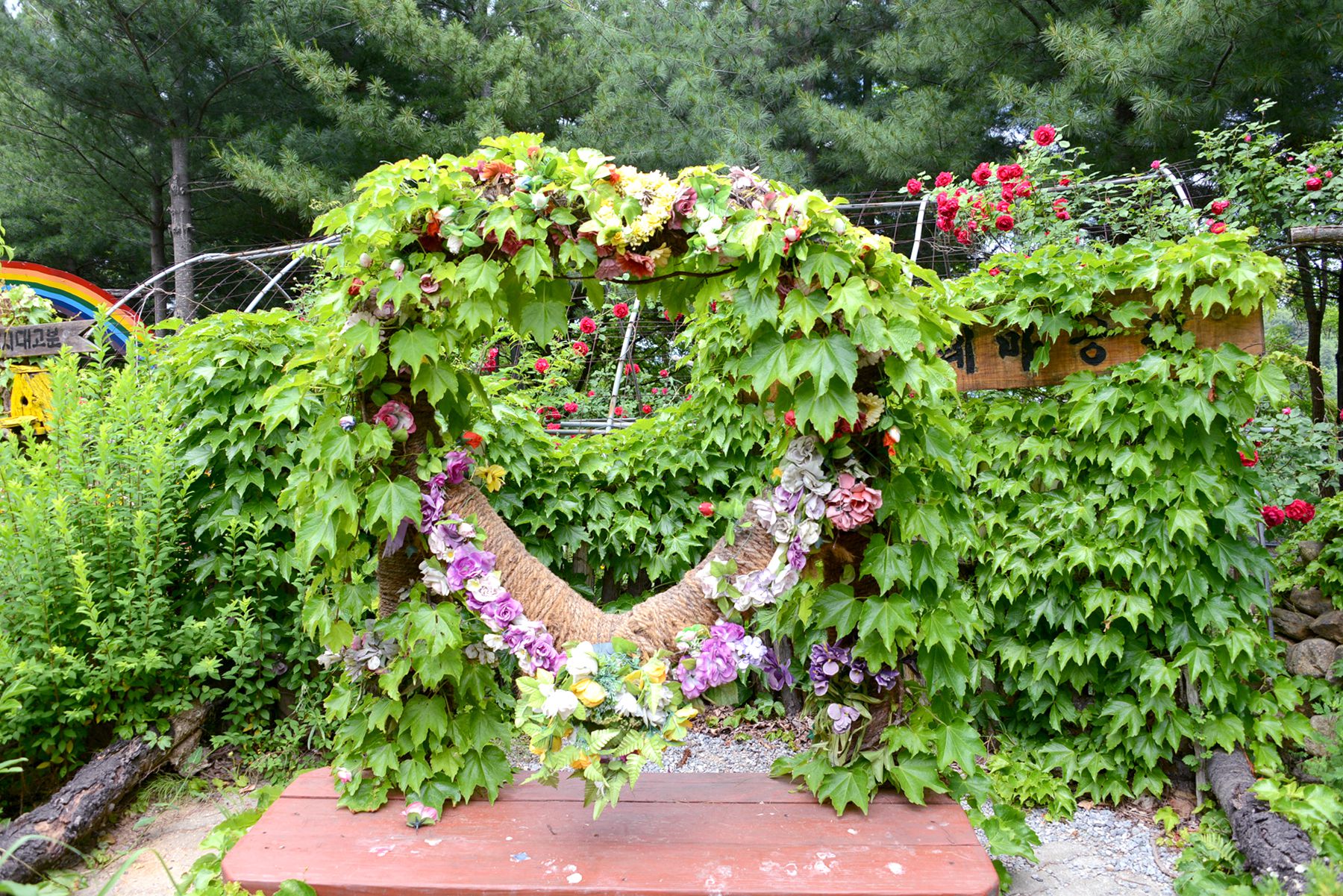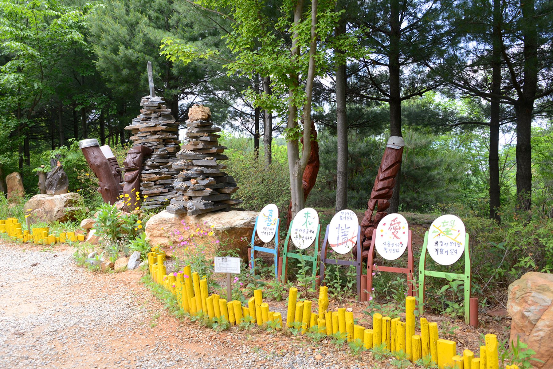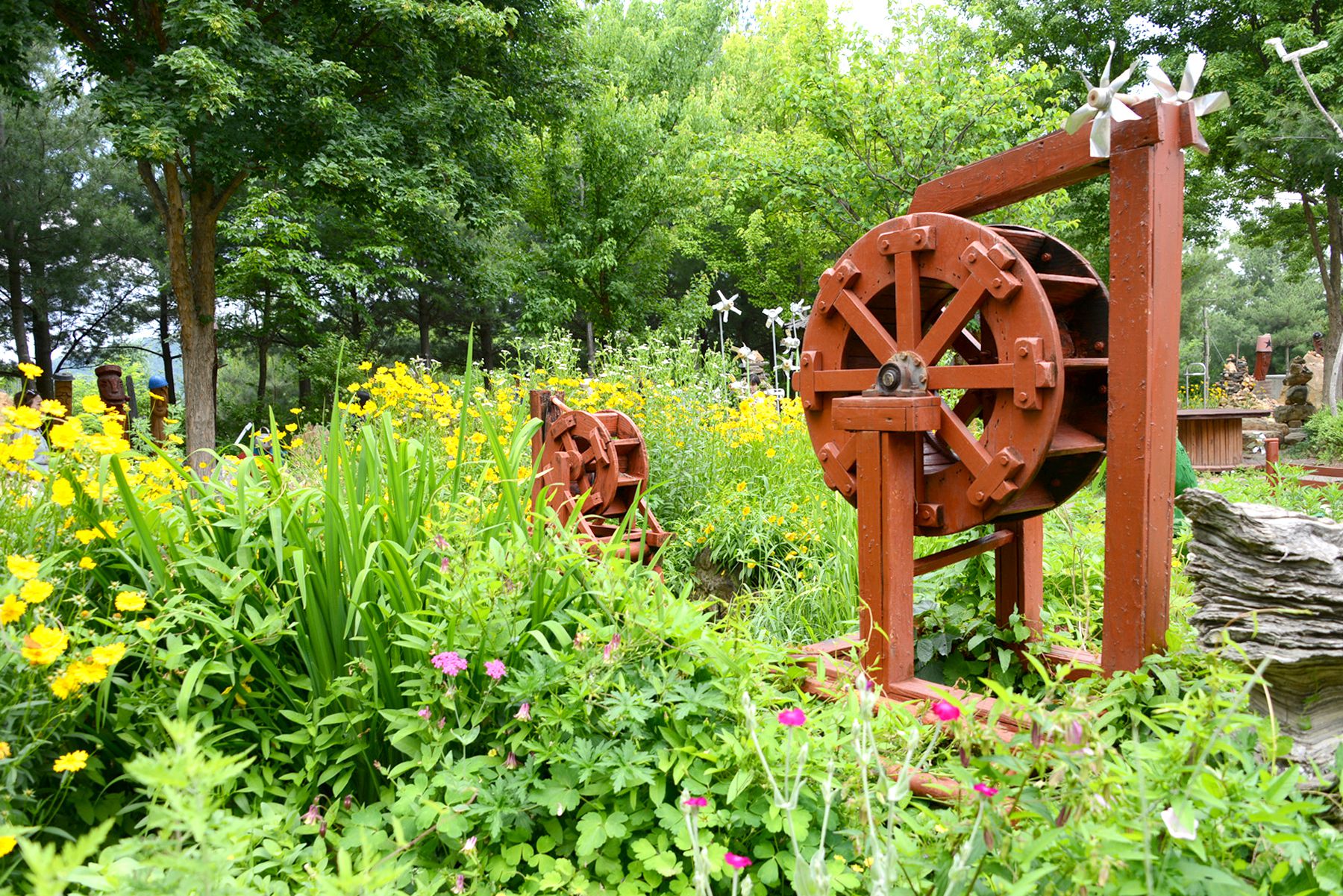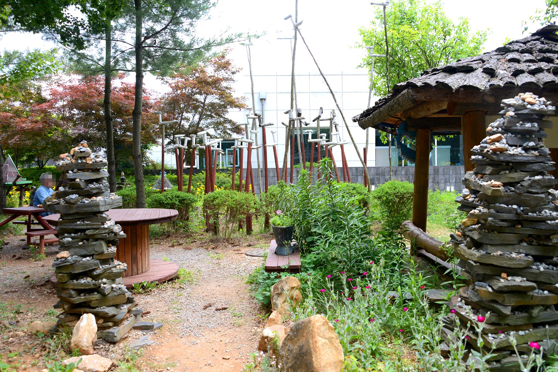 많이 넓진 않지만 형형색색의 야생화 등으로 작은 숲을 꾸며놓았고, 나무조형물, 인형 등을 배치해놓아 아기자기한 느낌을 주고 있답니다.