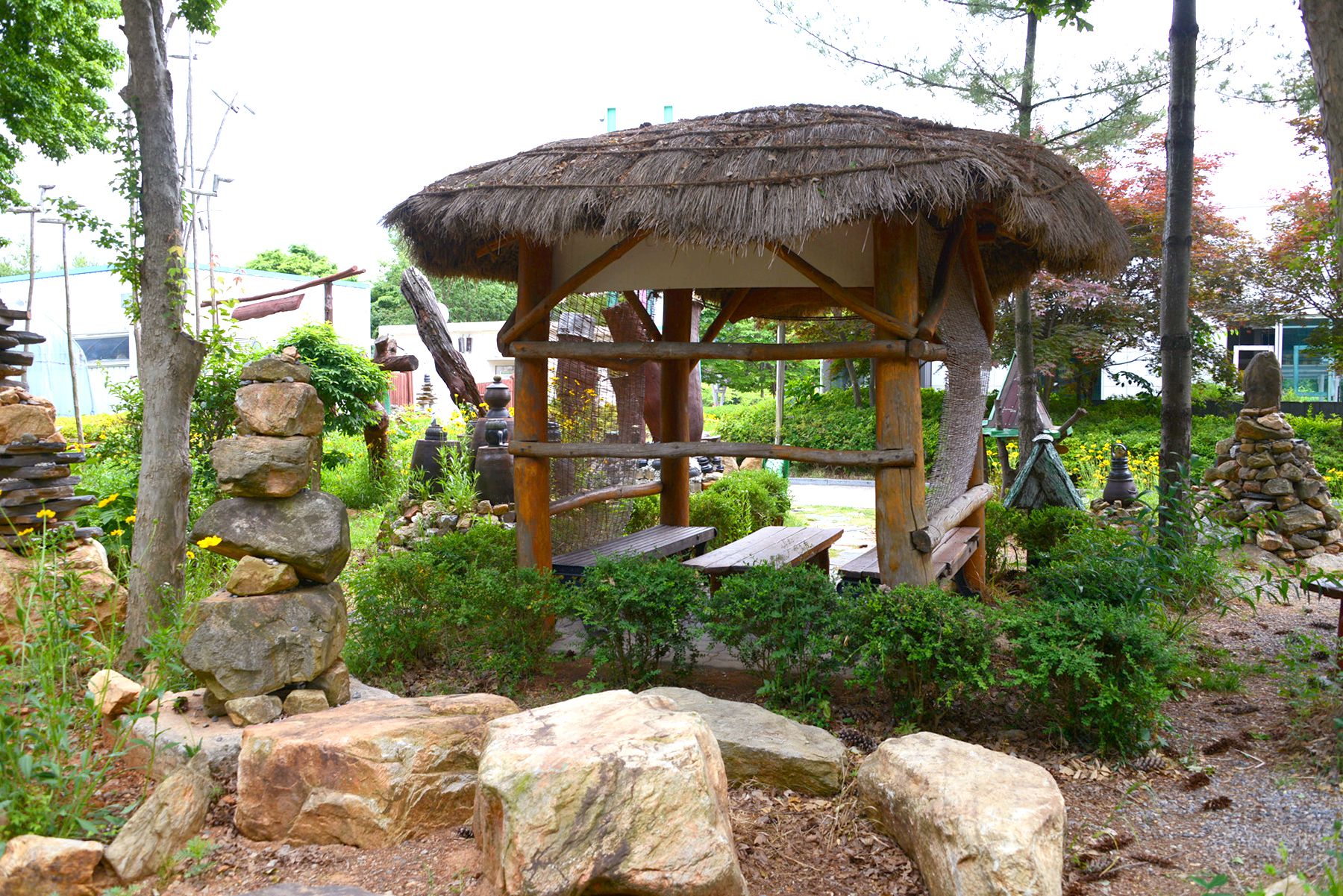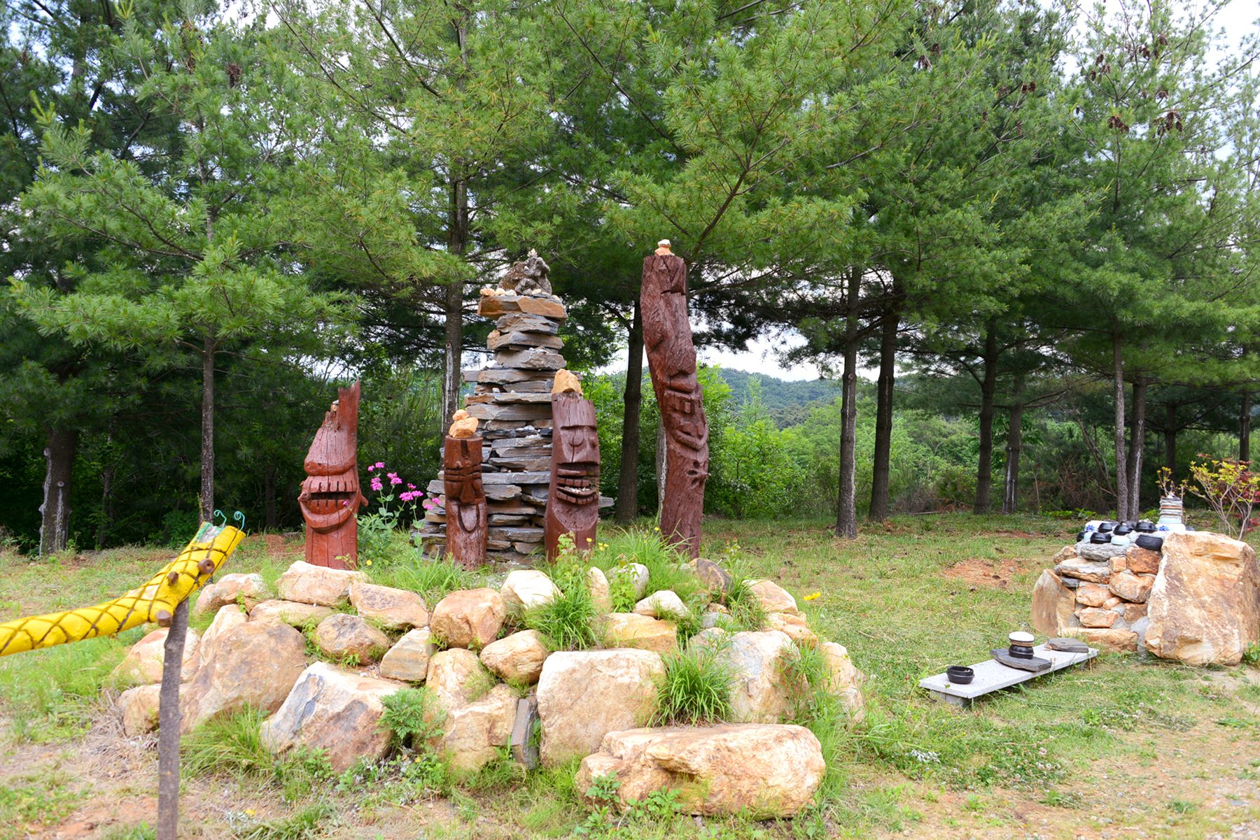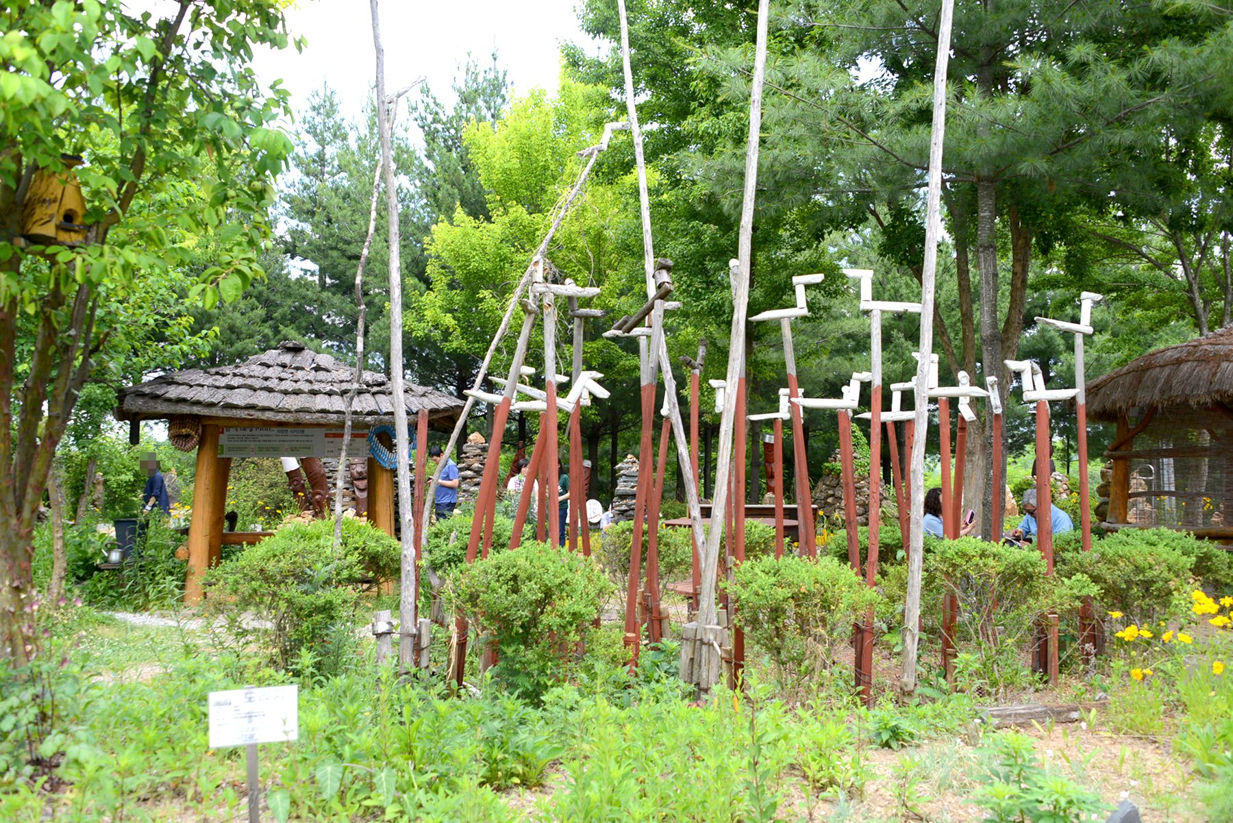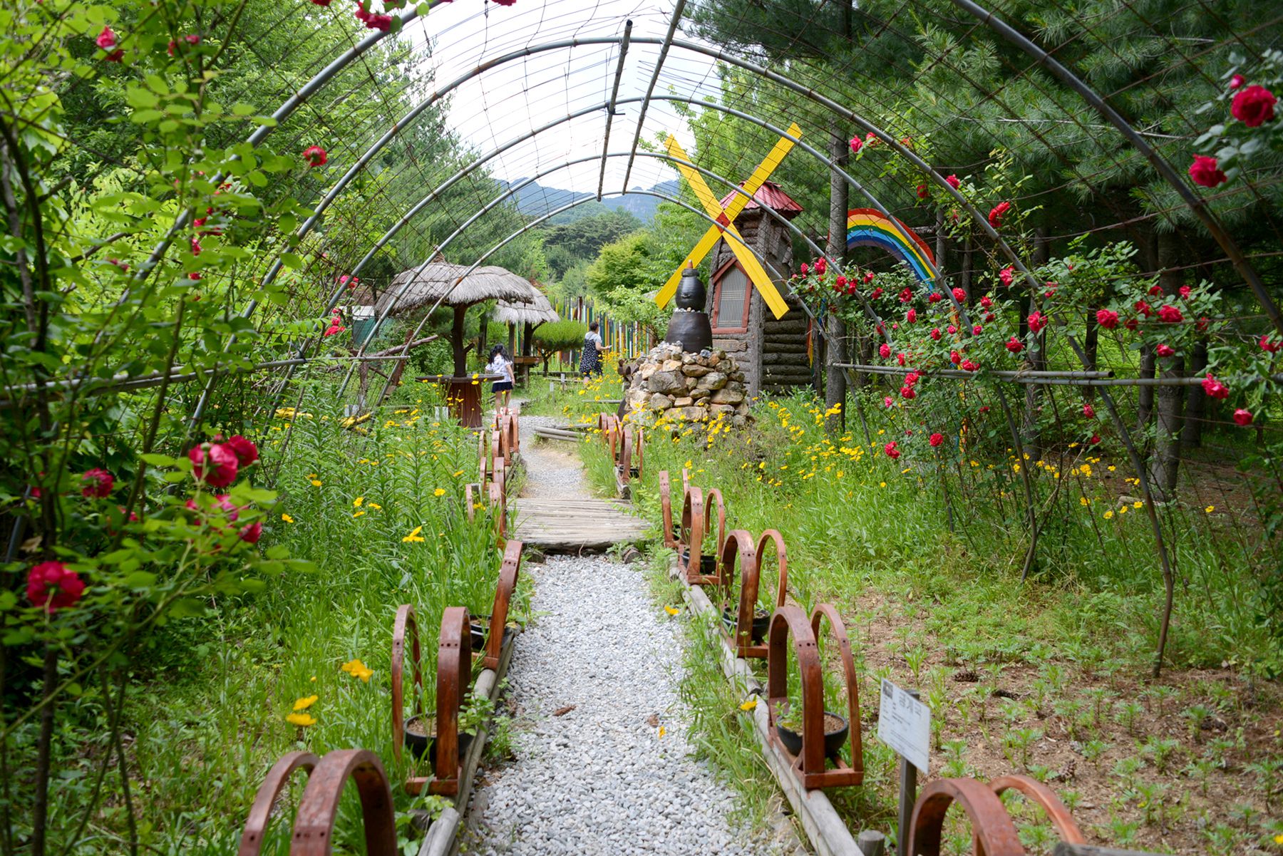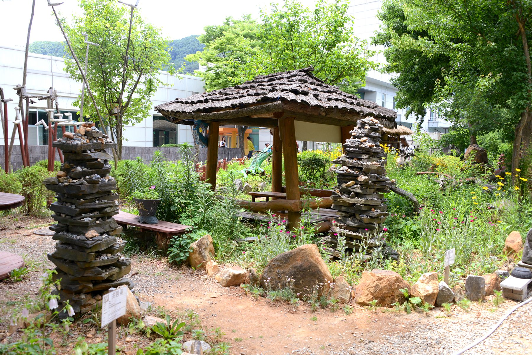 많이 넓진 않지만 형형색색의 야생화 등으로 작은 숲을 꾸며놓았고, 나무조형물, 인형 등을 배치해놓아 아기자기한 느낌을 주고 있답니다.