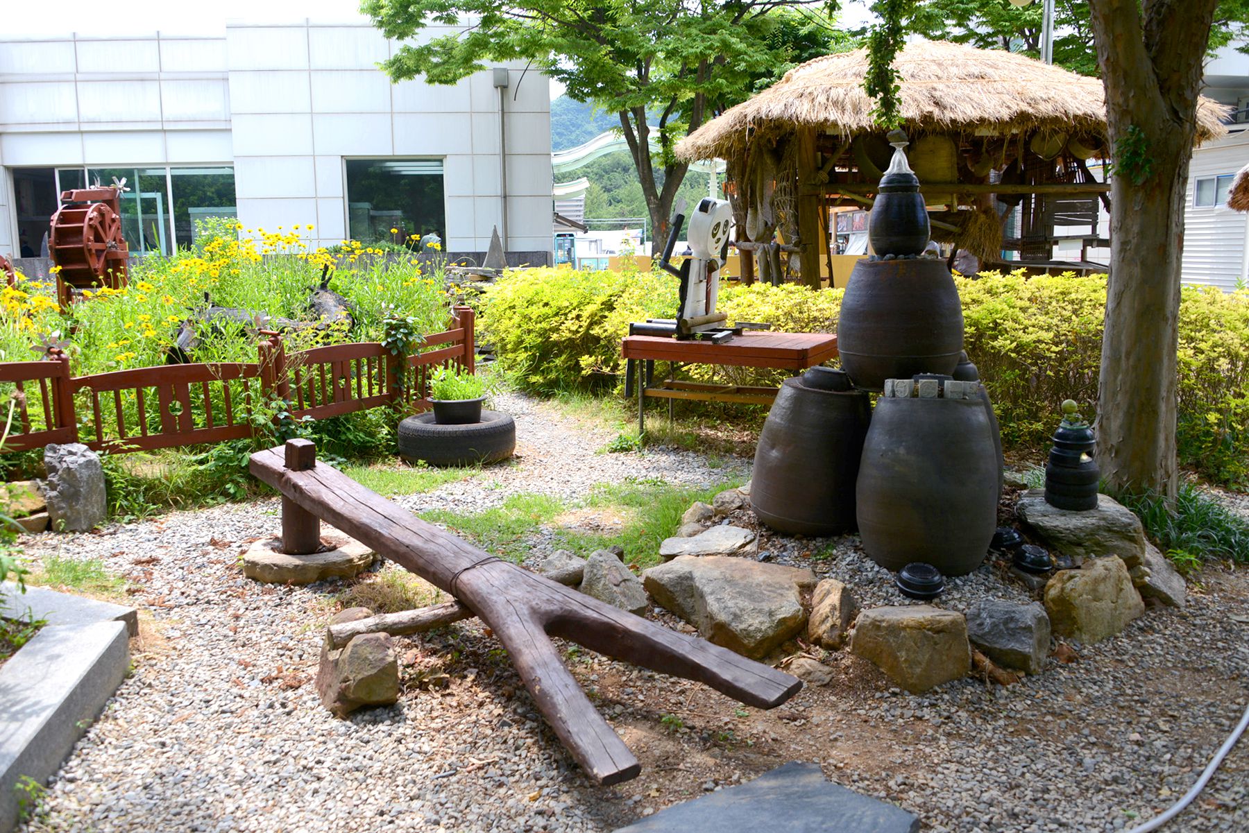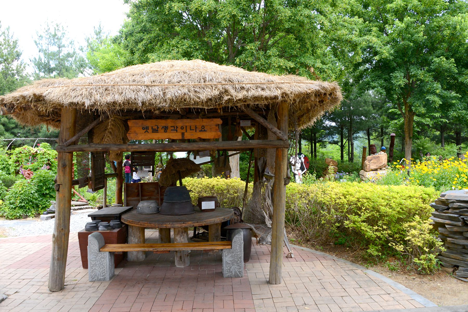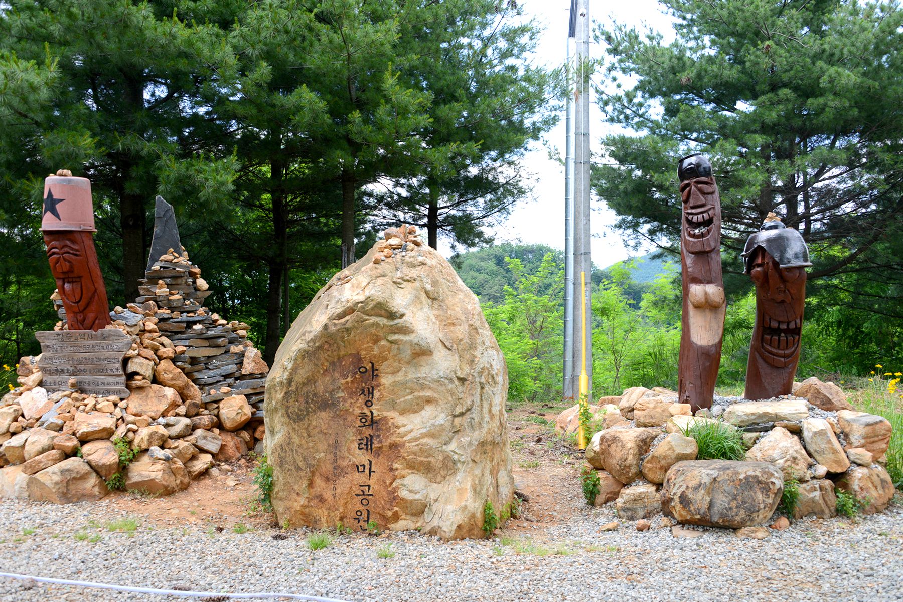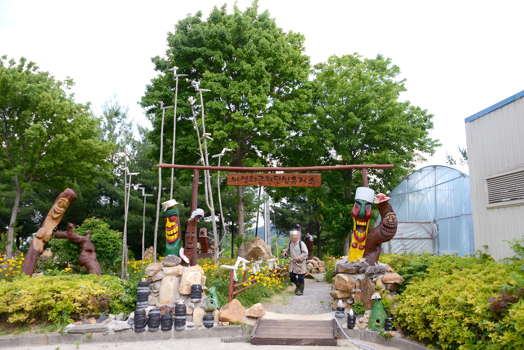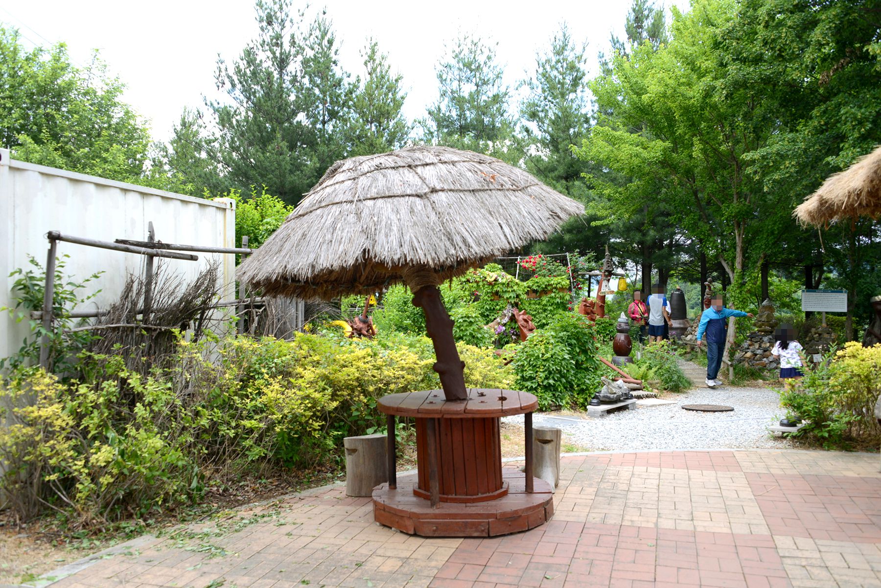 휴게소가 마련된 테마공원 내에는 쟁기와 소총, 지게, 디딜방아, 풍차 등 다채로운 대형 조형물이 설치되어 있어