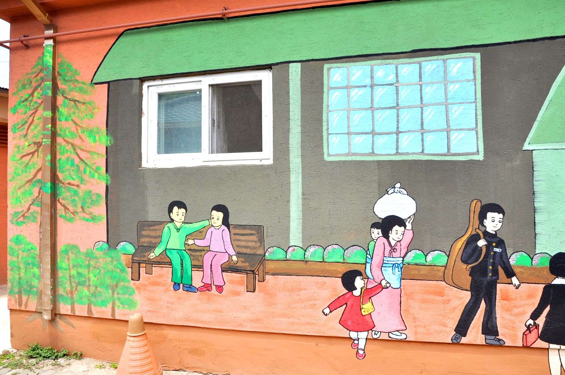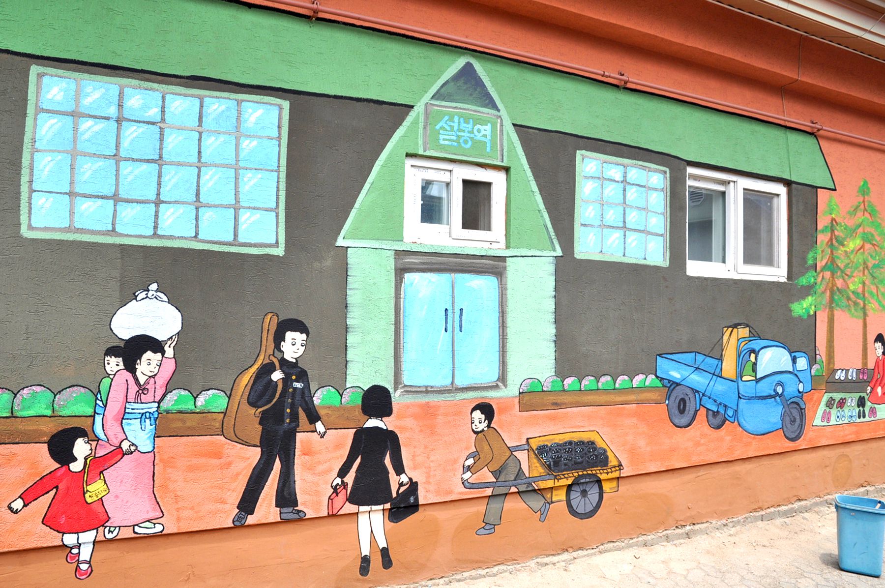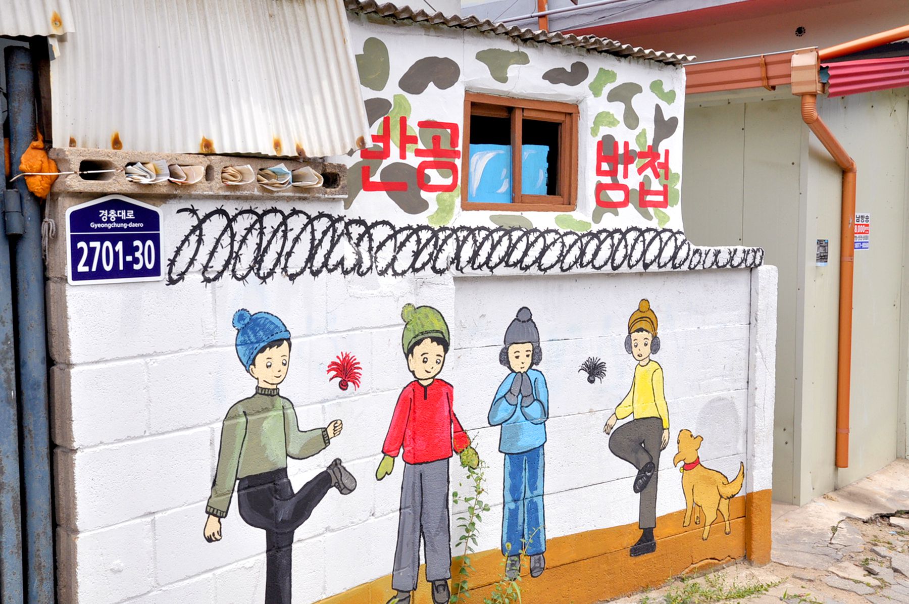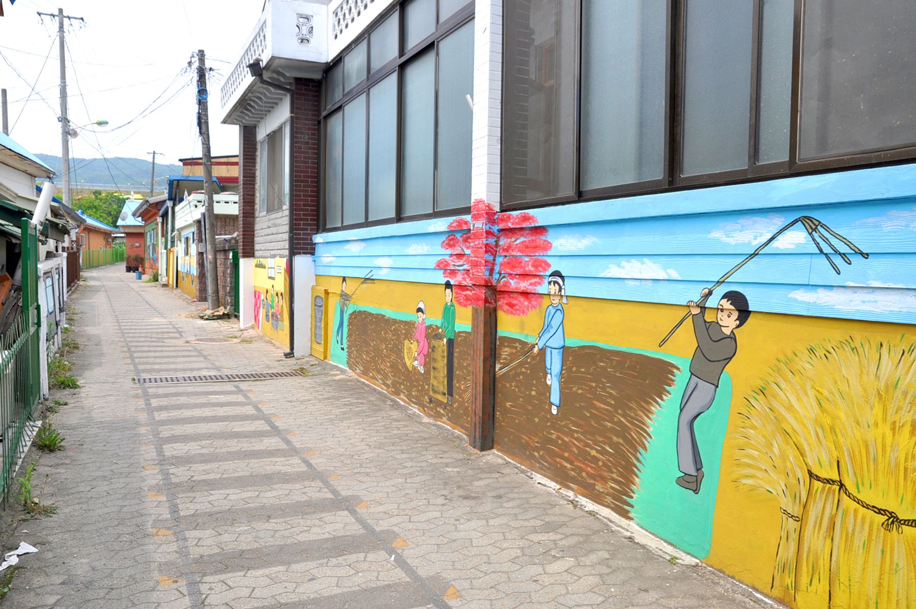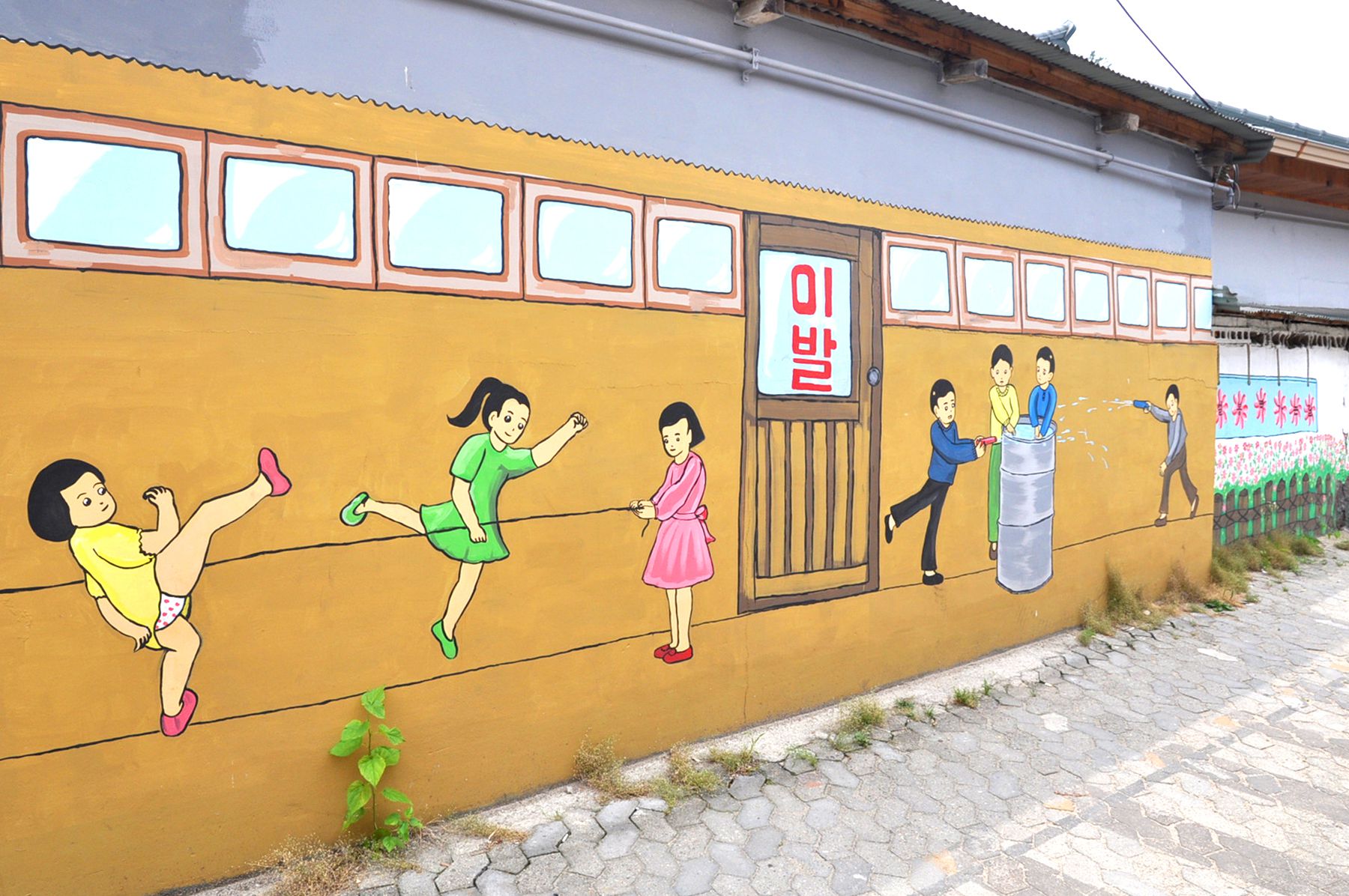 벽화골목의 담장에는 아이들이 철봉에 매달려 노는 모습, 검정색 교복을 입고 앉아있는 모습, 화롯불에 고구마가 익기를 기다리는 모습 등