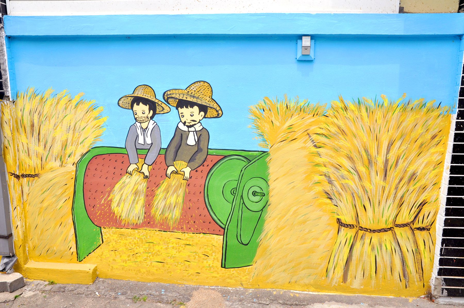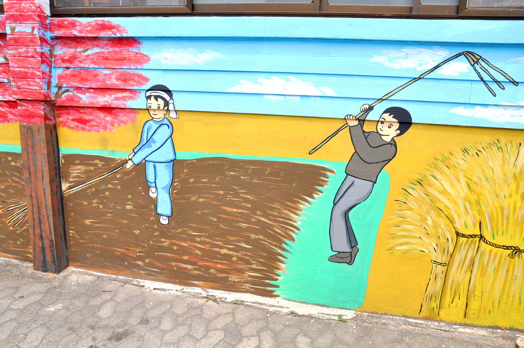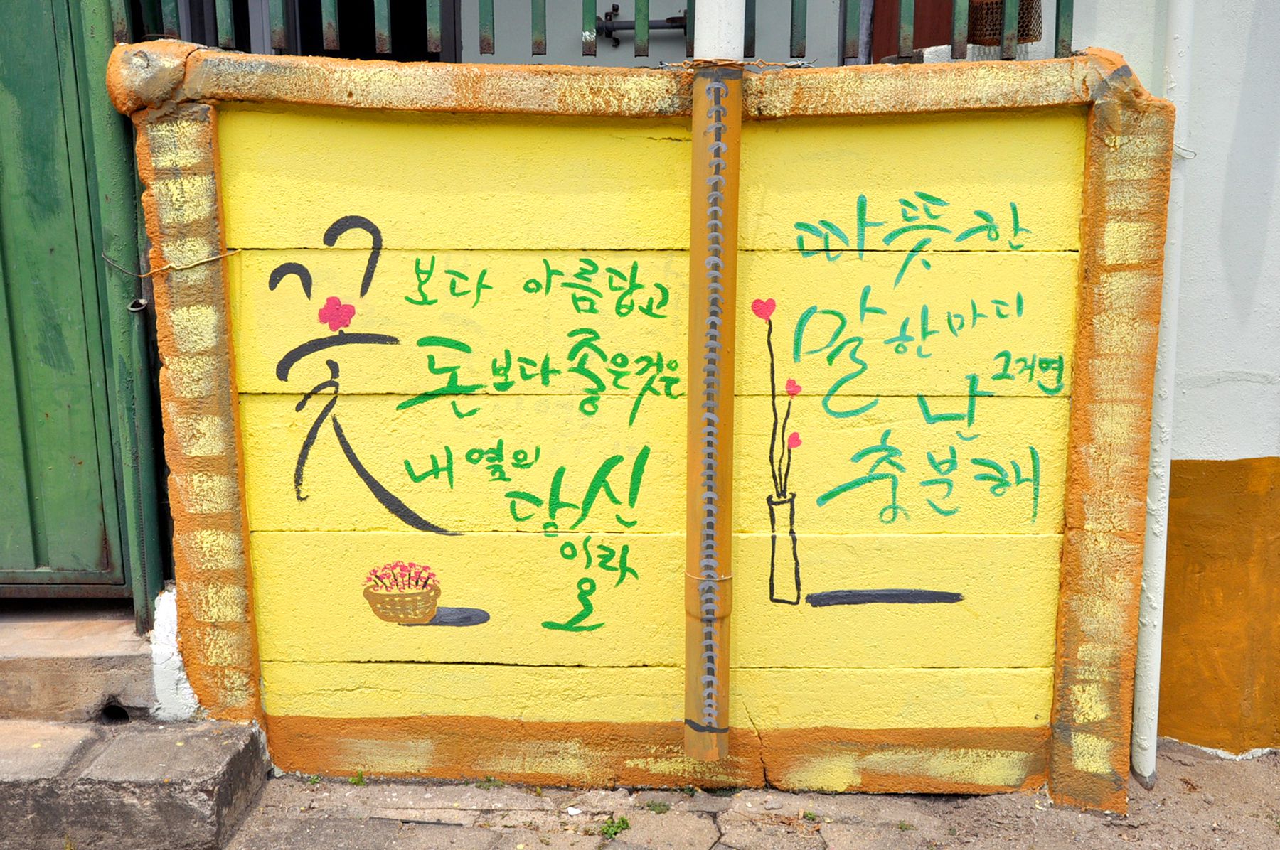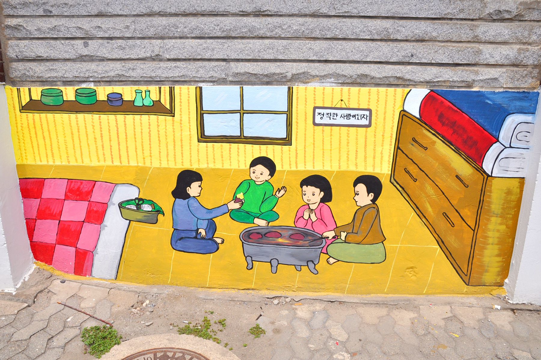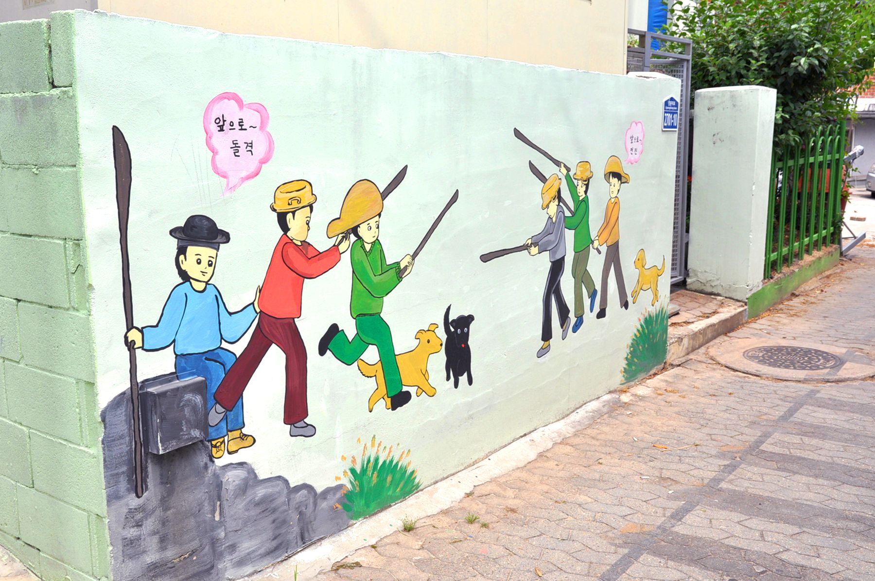 벽화골목의 담장에는 아이들이 철봉에 매달려 노는 모습, 검정색 교복을 입고 앉아있는 모습, 화롯불에 고구마가 익기를 기다리는 모습 등