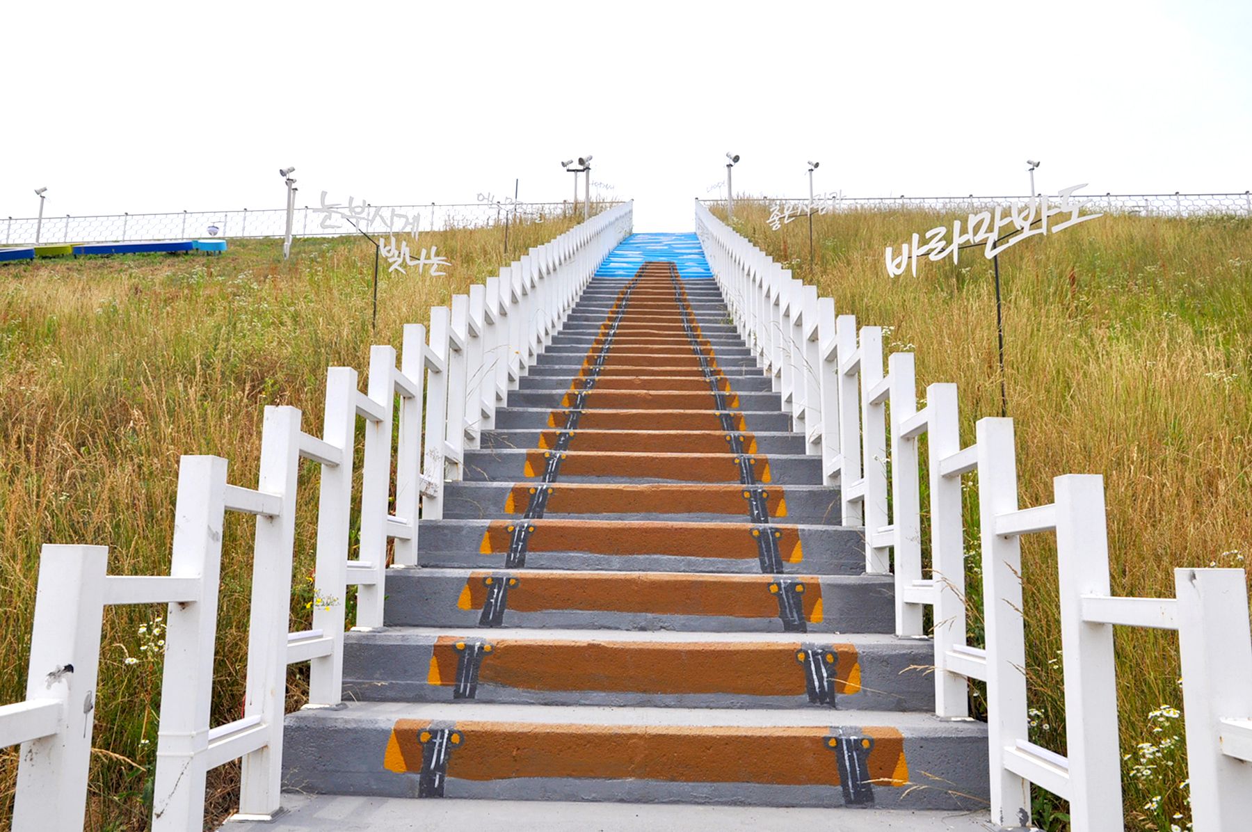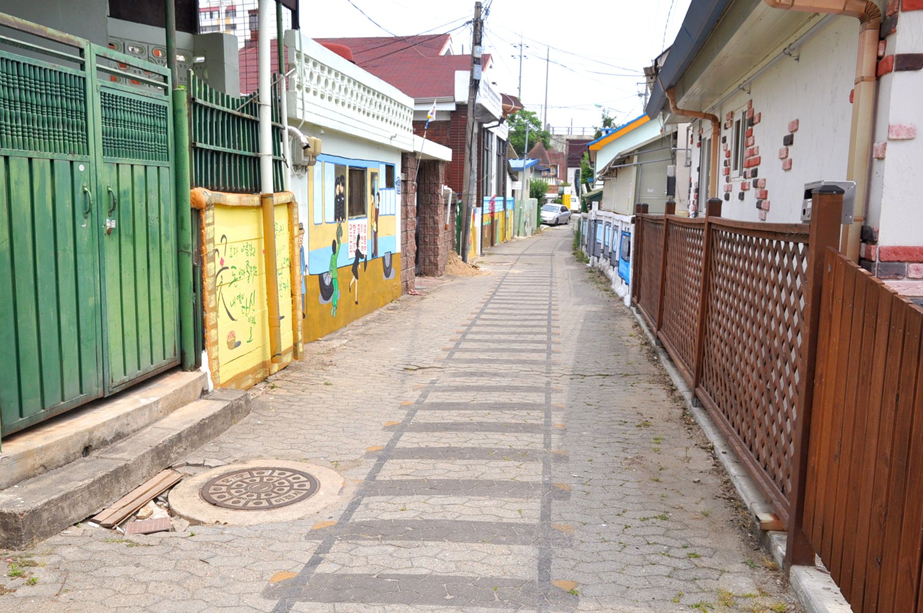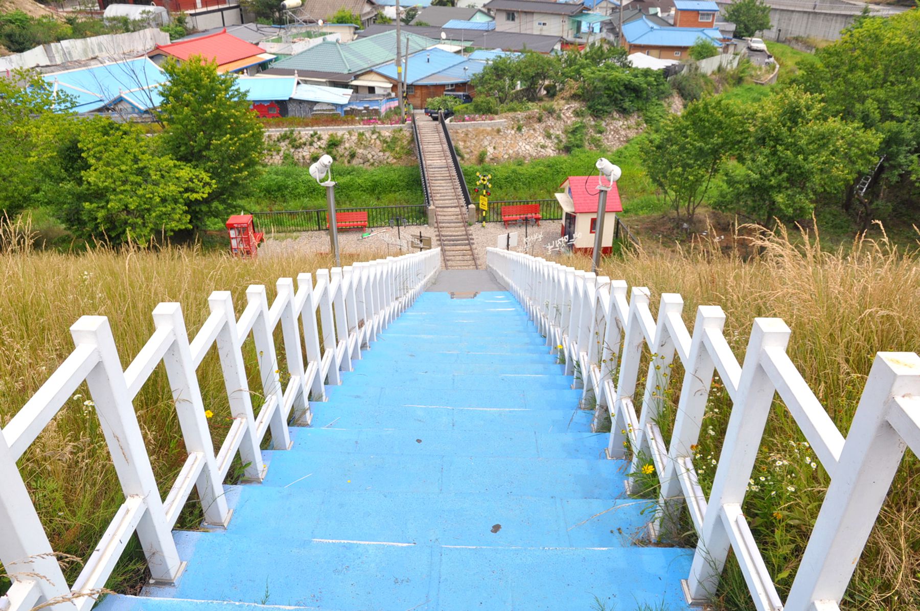 설봉호수 제방 아래 조그마한 동네로 이어지는 기다란 계단 위 그려진 기찻길은 설봉호수 아래 주택들이 모여있는 마을의 골목길로 이어지는데요,