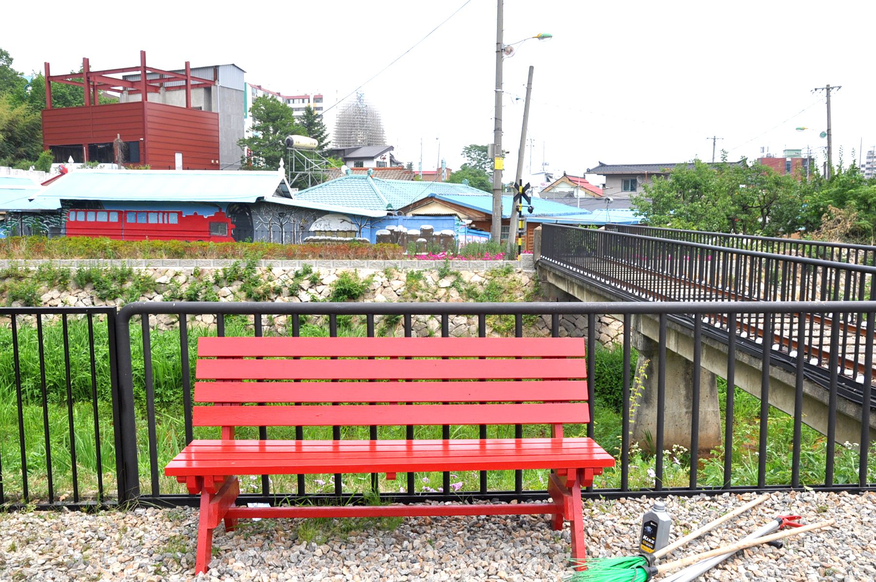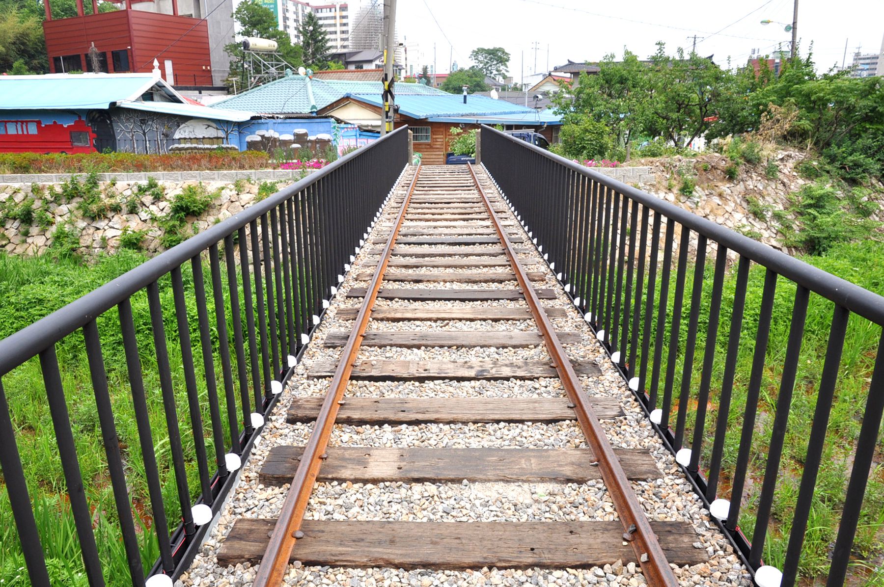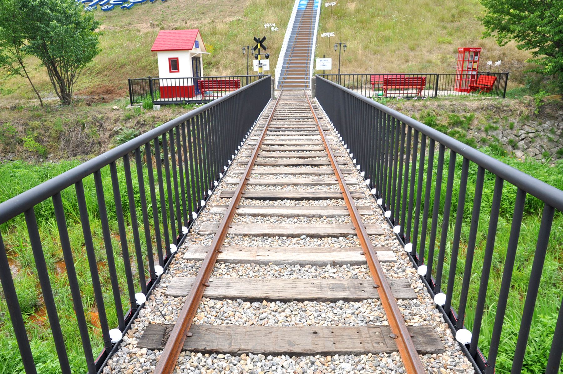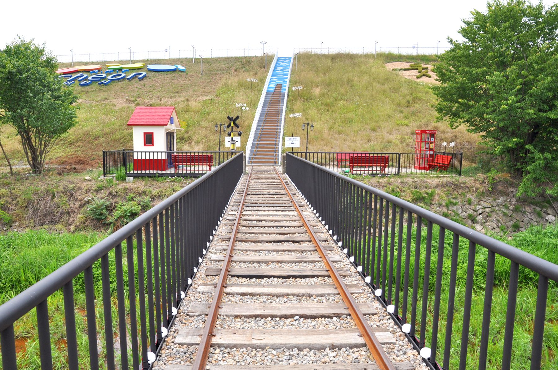 설봉호수 제방 아래 조그마한 동네로 이어지는 기다란 계단 위 그려진 기찻길은 설봉호수 아래 주택들이 모여있는 마을의 골목길로 이어지는데요,