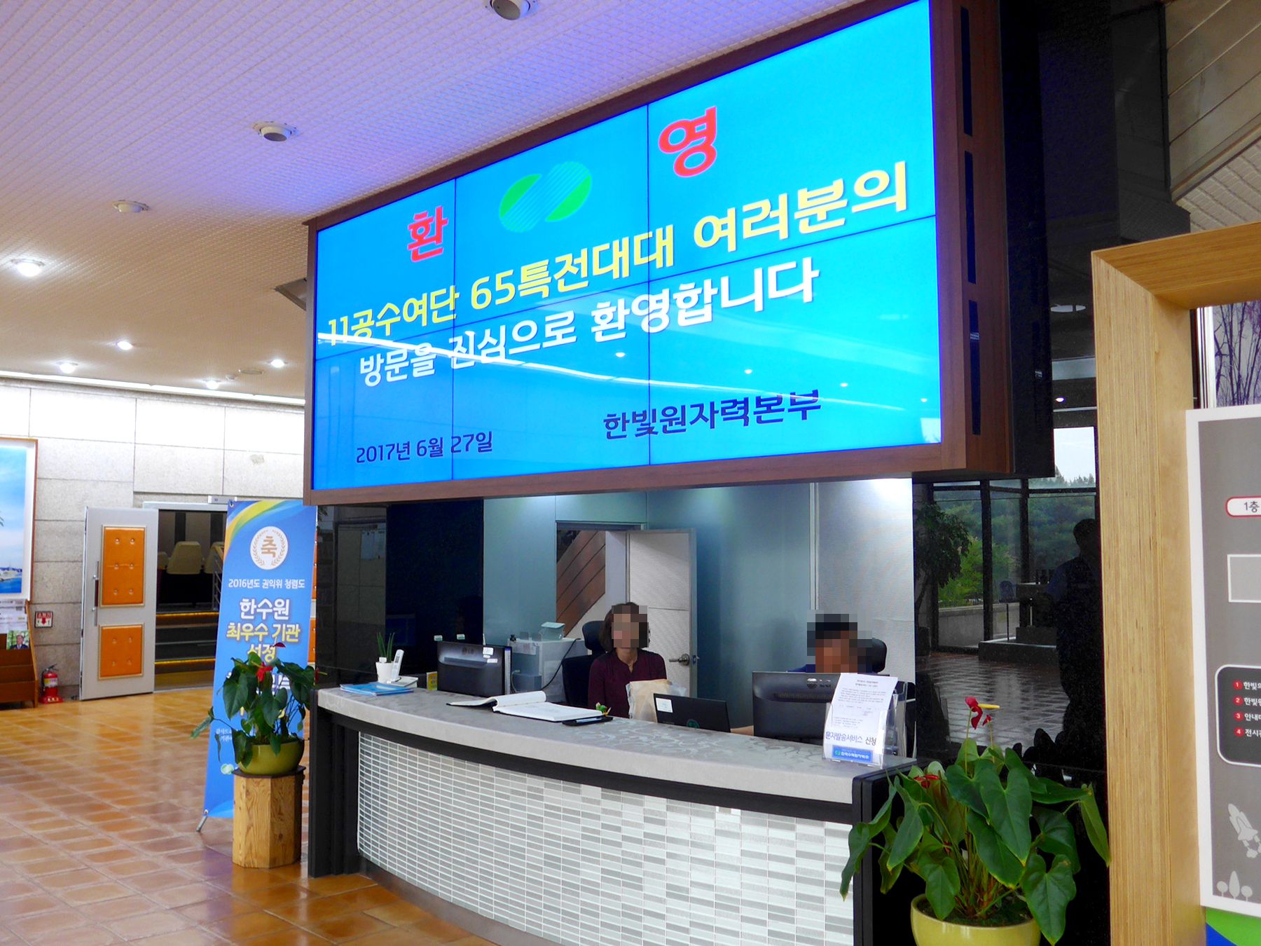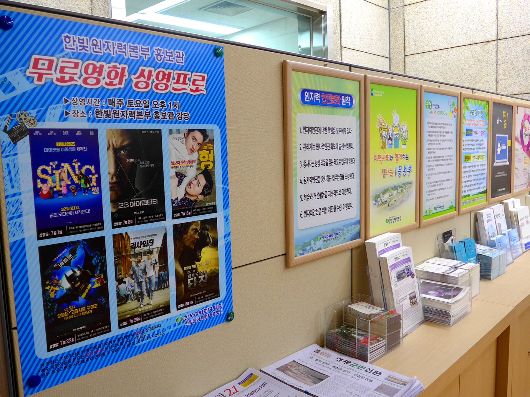 먼저 1층 로비에 들어서면 안내데스트와 한켠에 위치한 홍보물을 만나볼 수 있습니다.