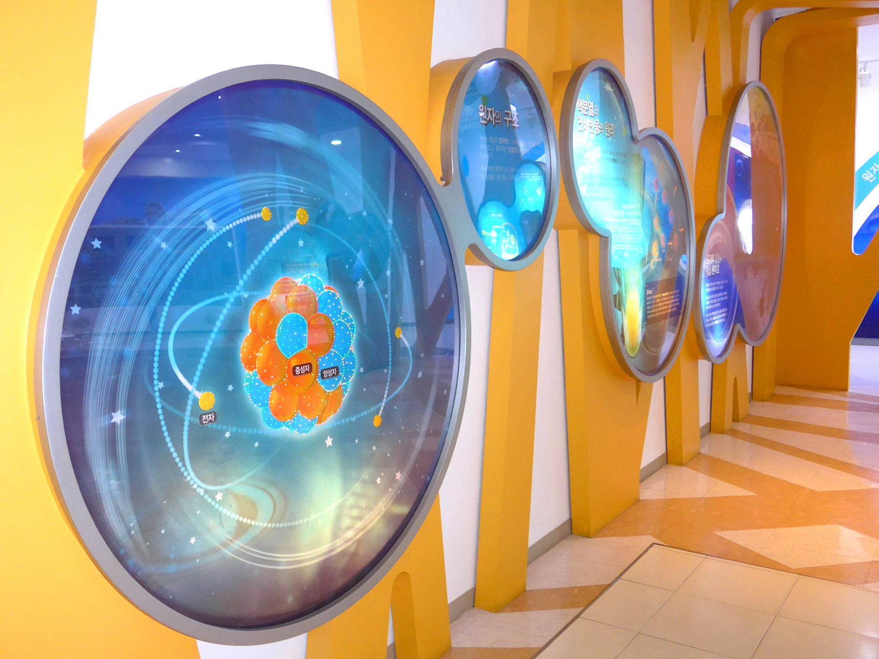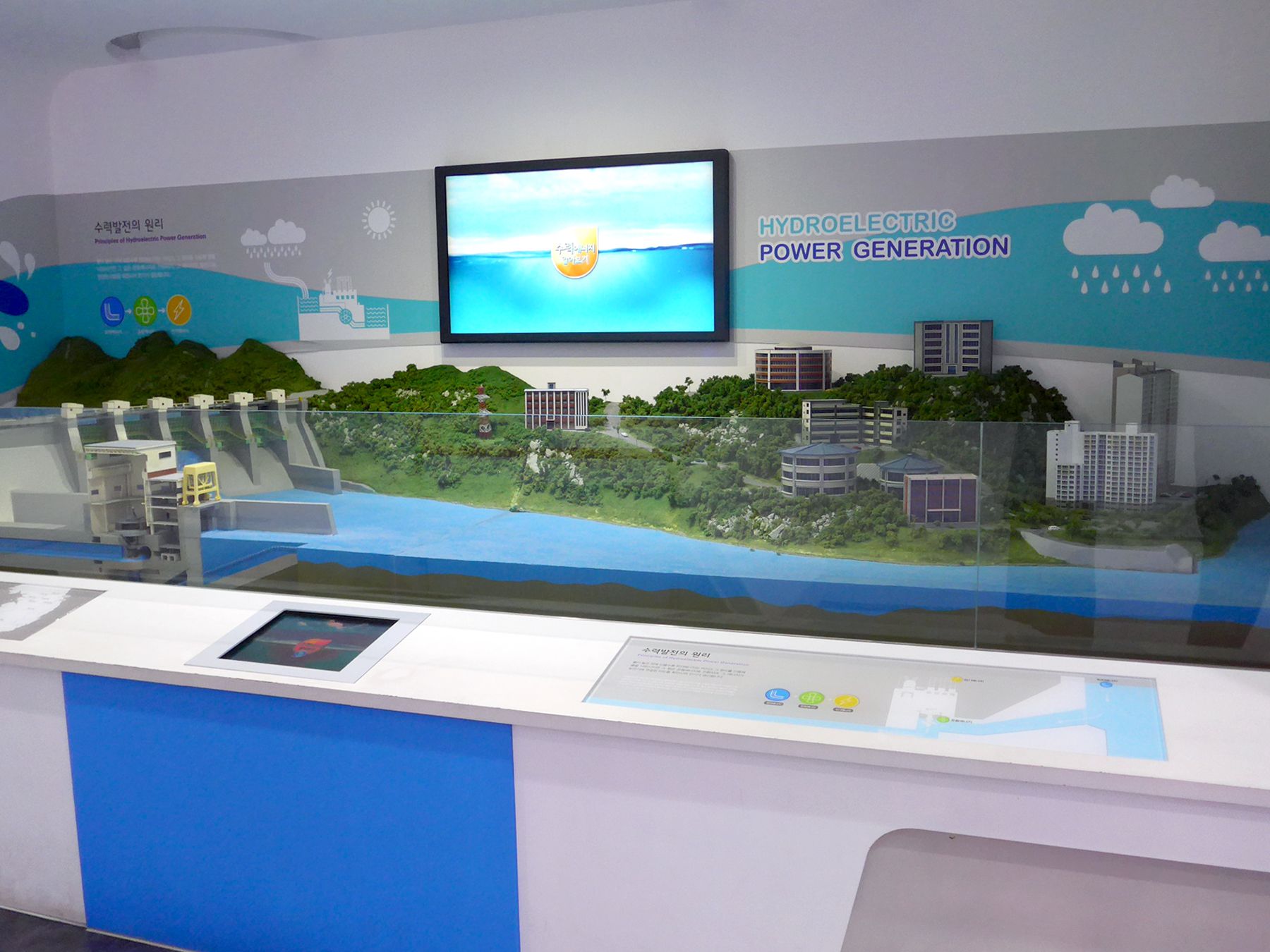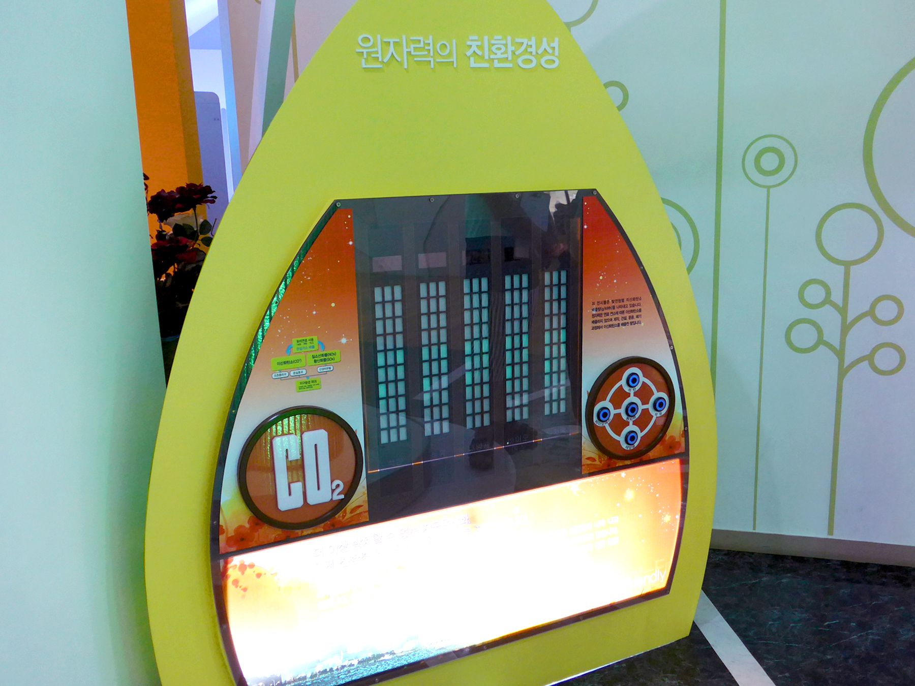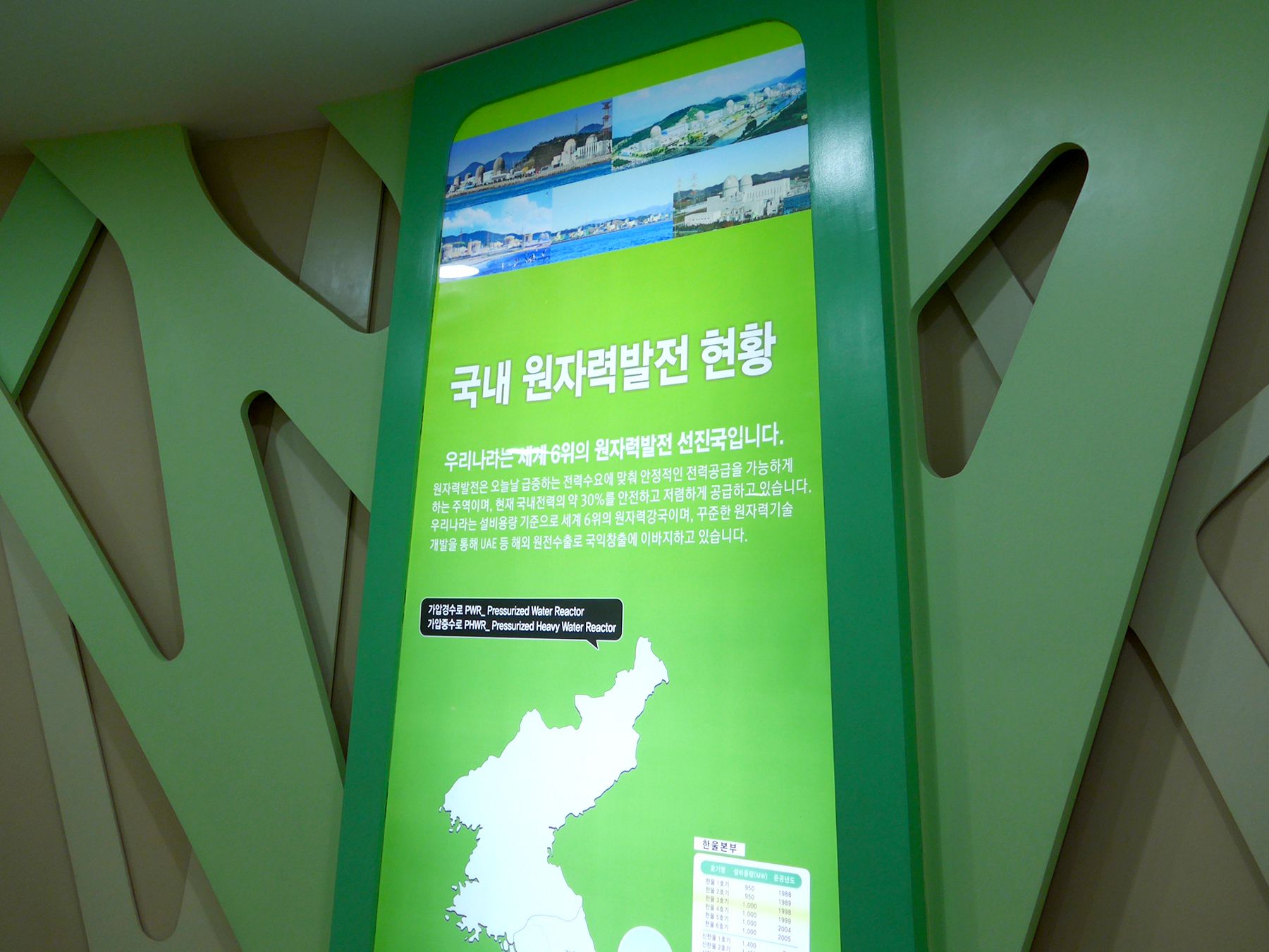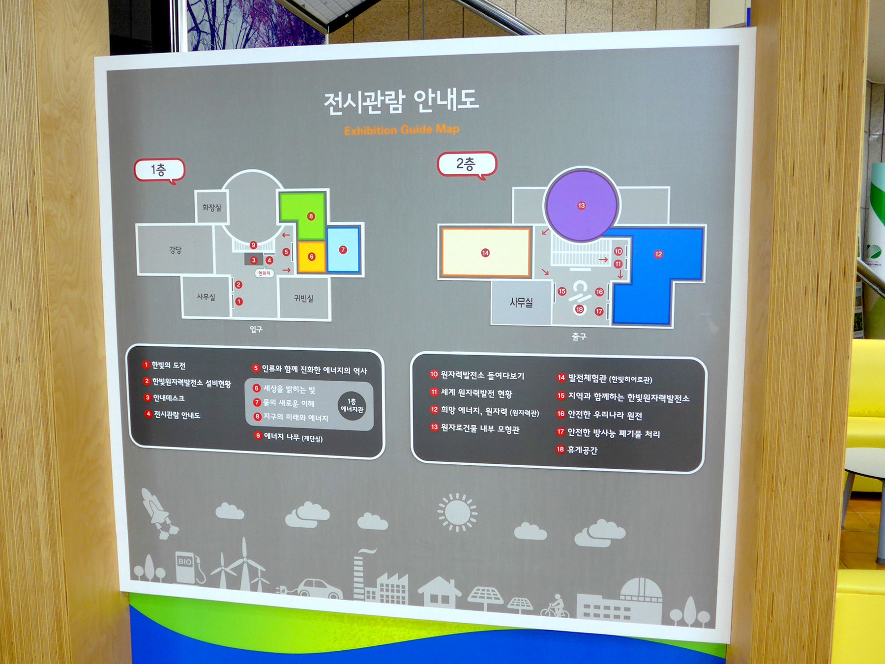 한빛원자력 홍보관은 발전소 외부에 별도의 공간으로 꾸며져 있으며 1층에 전기와 물, 에너지에 대한 전시실이 있고 2층에 원자력 전시관이 있습니다.