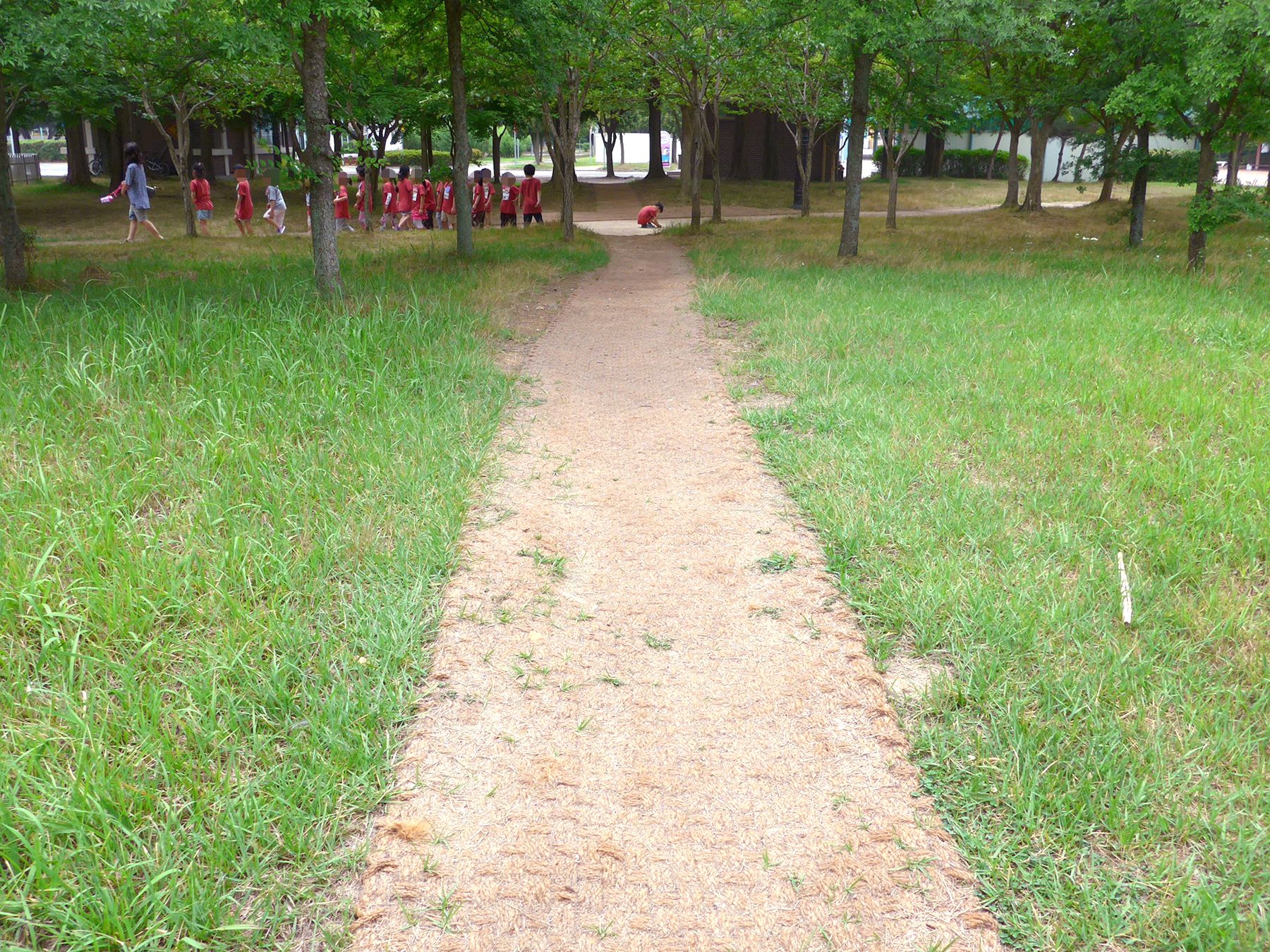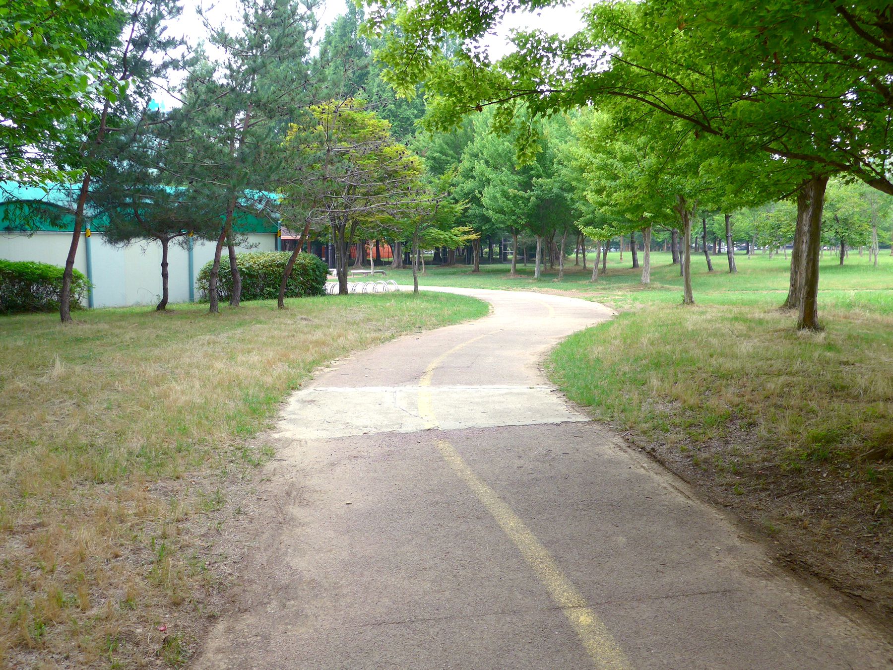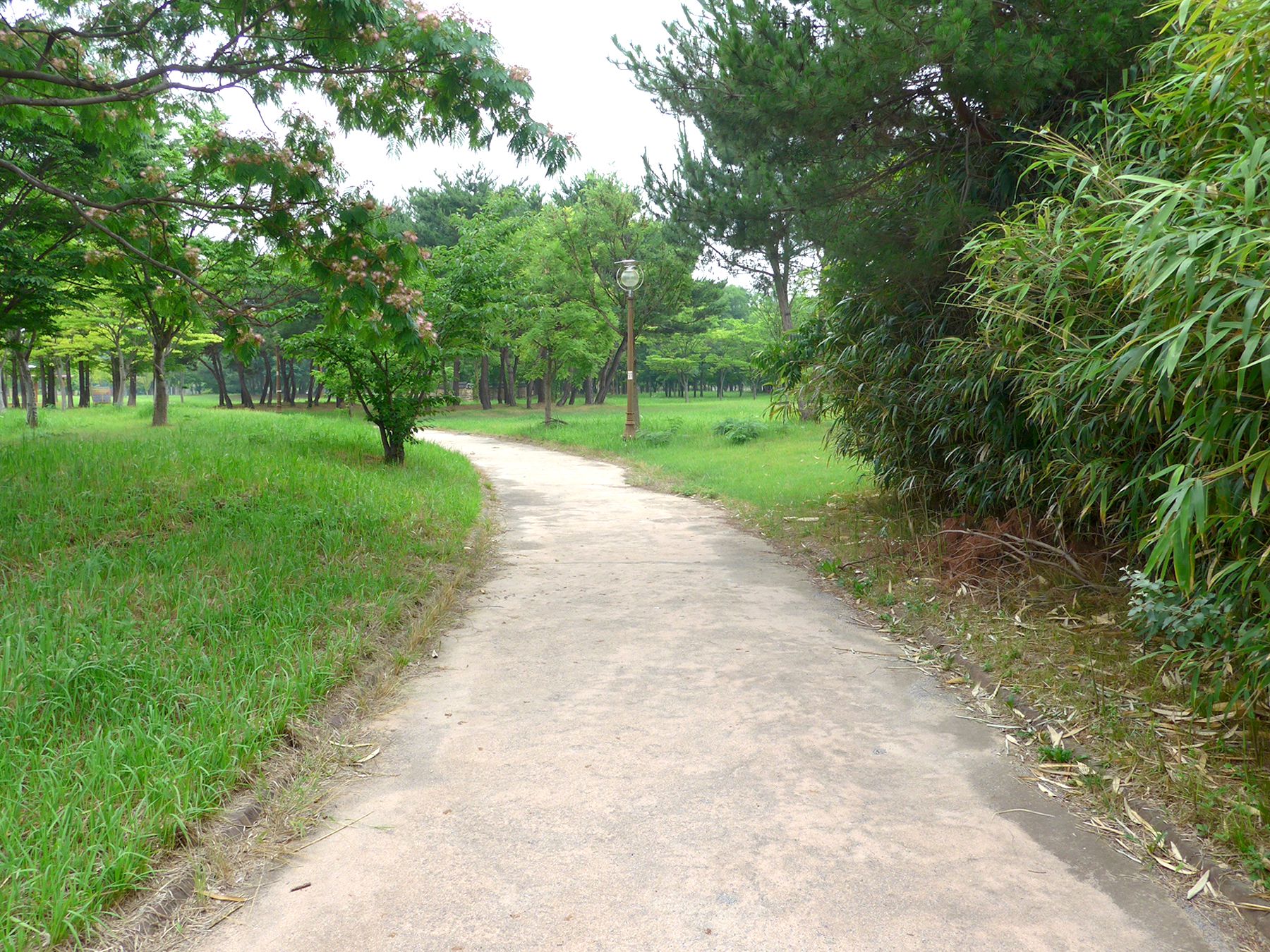 쭉 뻗은 산책로와 우거진 숲 사이로 휴식을 취하기 매우 좋은 첨단근린공원은