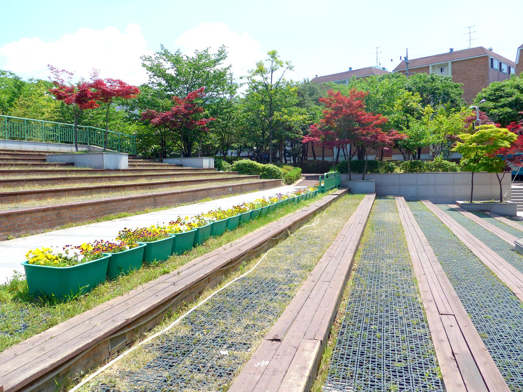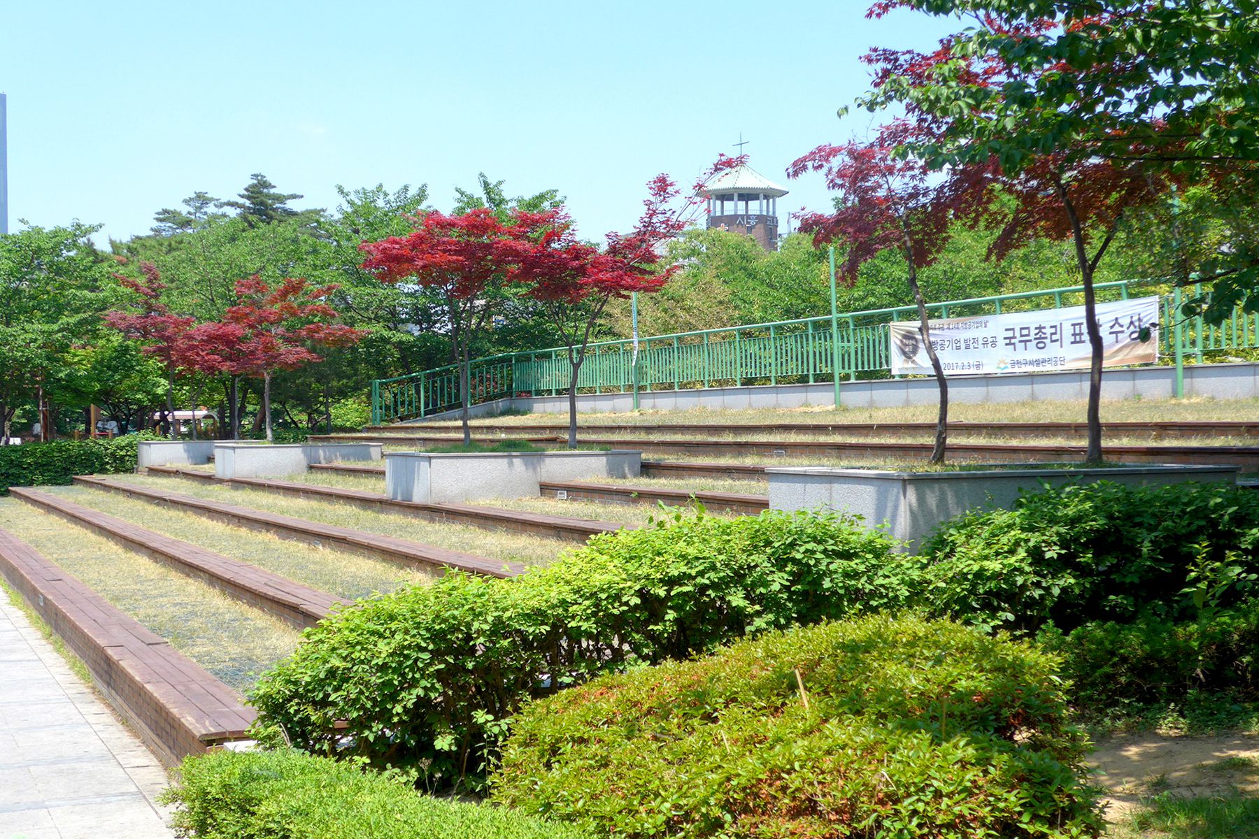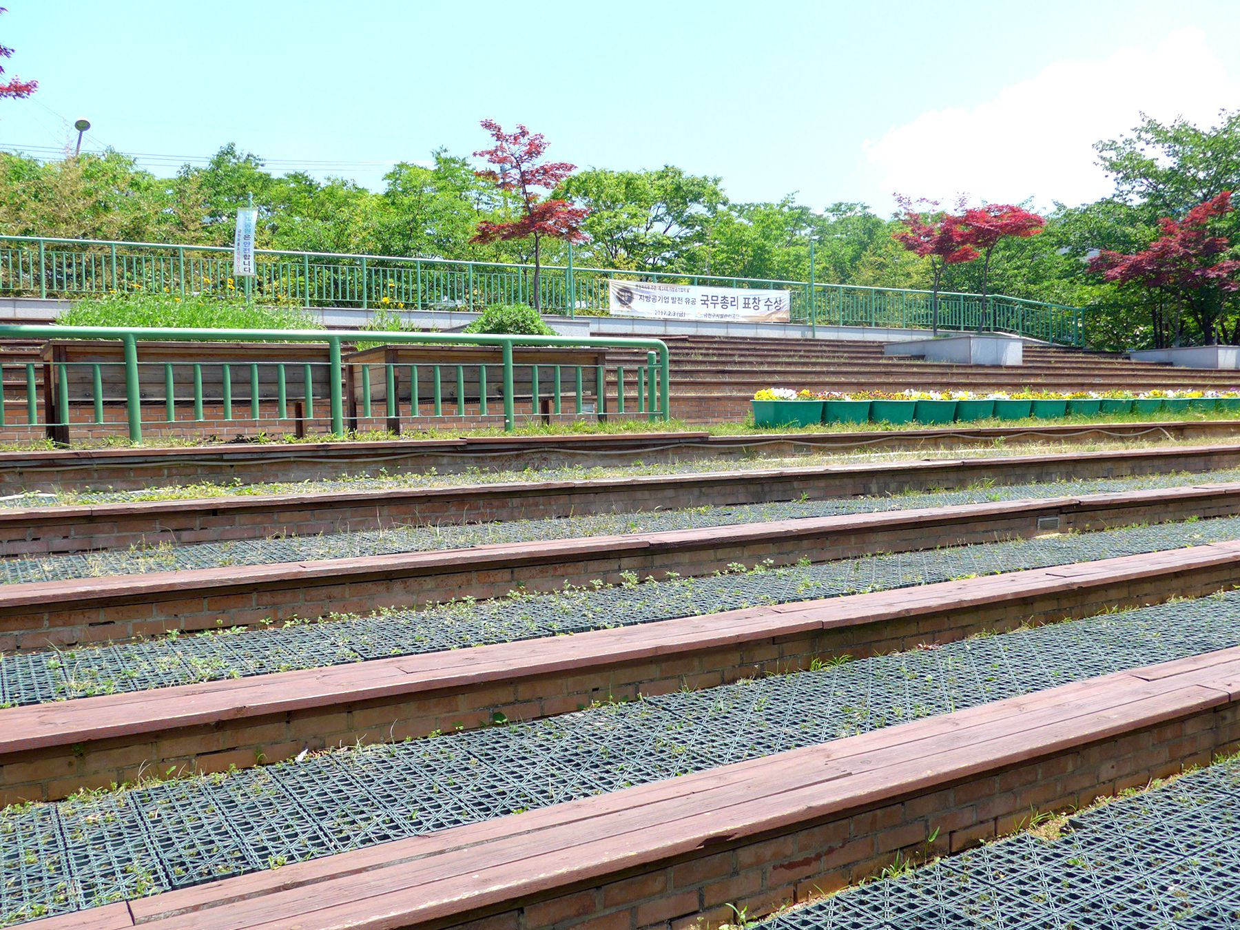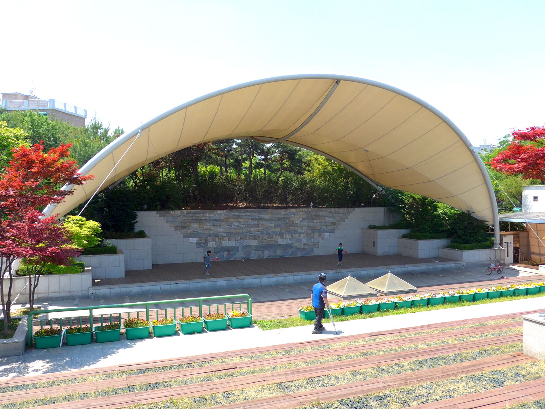 금빛공원에는 야외무대와 600석 규모의 관람석, 나무그늘 아래 벤치들이 많이 구비되어 있어 휴식을 취하기 아주 좋은데요,