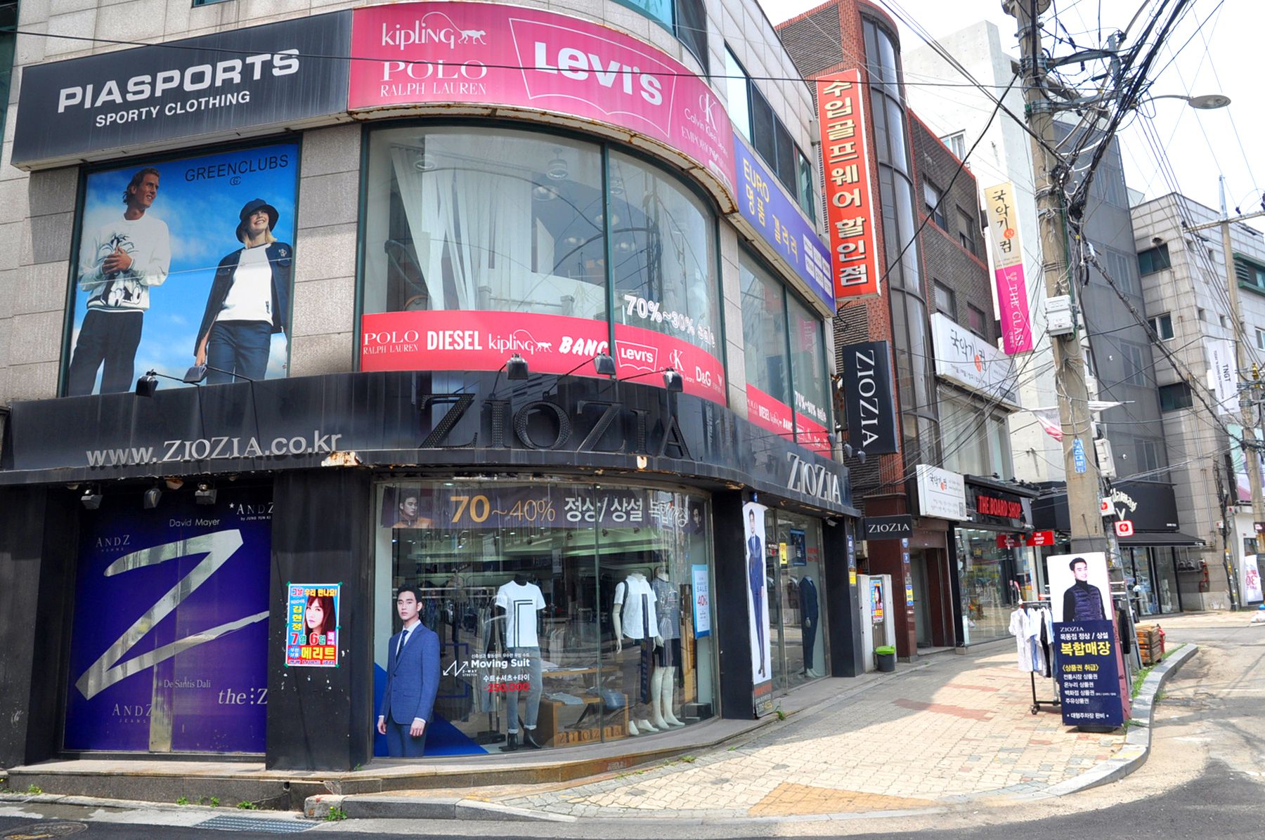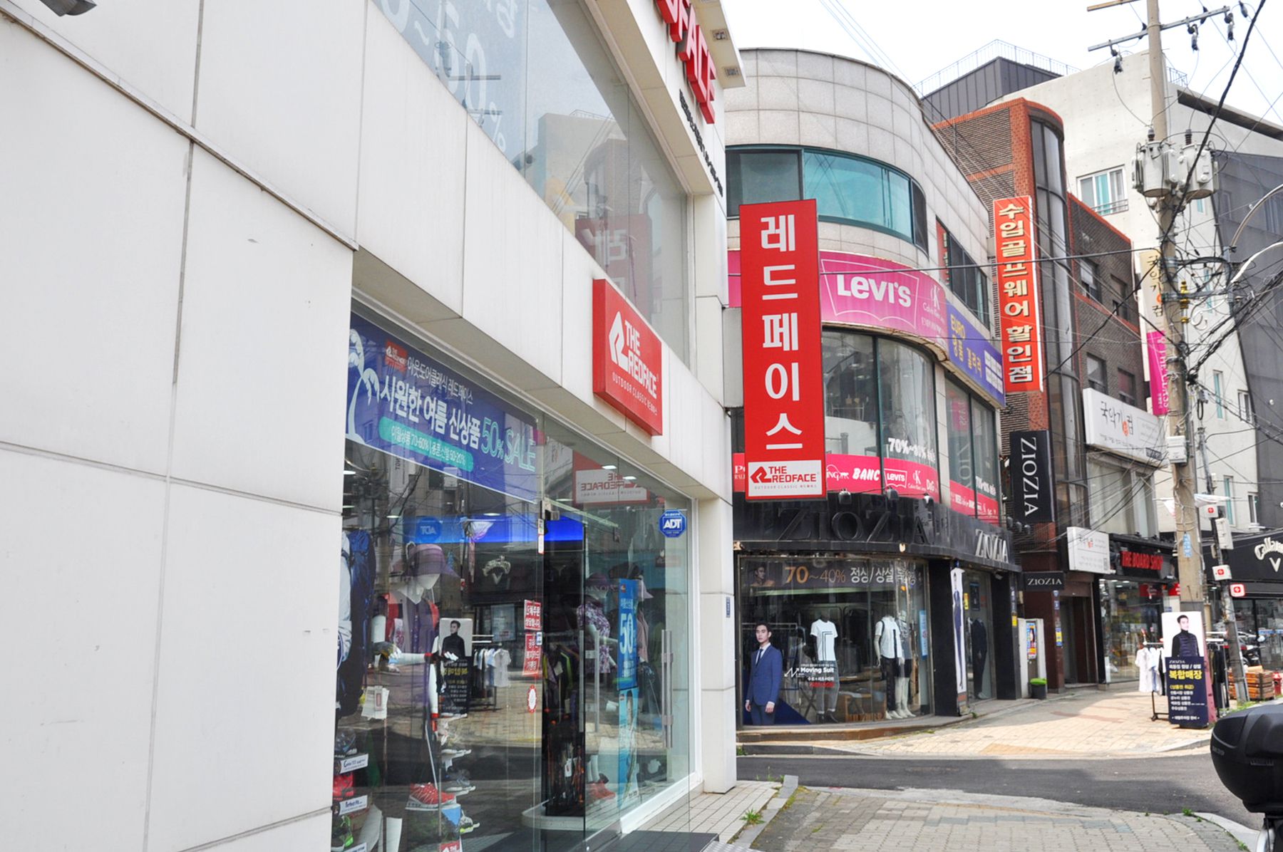의류매장들이 흩어지지 않고 한데 모여 테마거리를 이루고 있습니다.