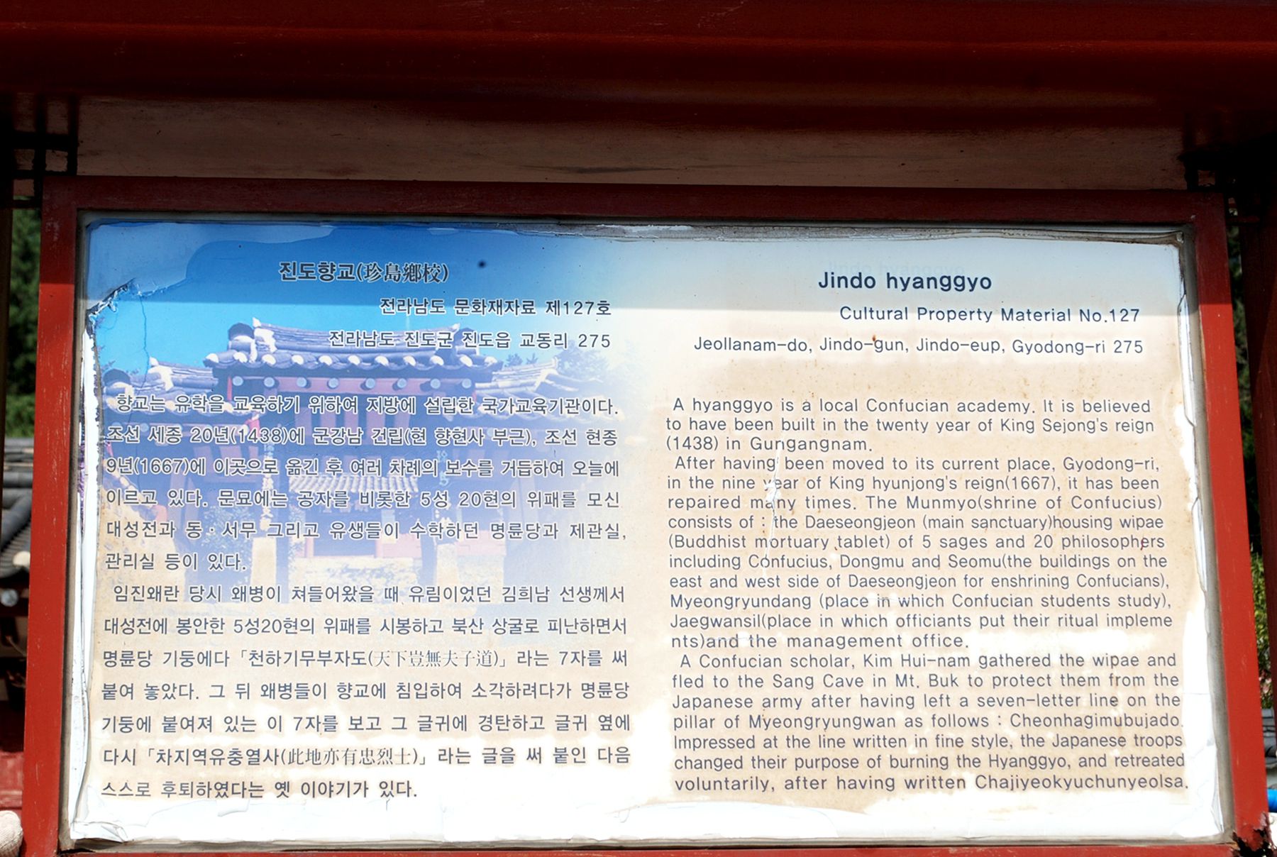 진도향교는 전남문화재자료 제127호로 1985년에 지정되었으며, 원래 1437년(세종 20)에 진도읍성의 동쪽에 지어졌고,