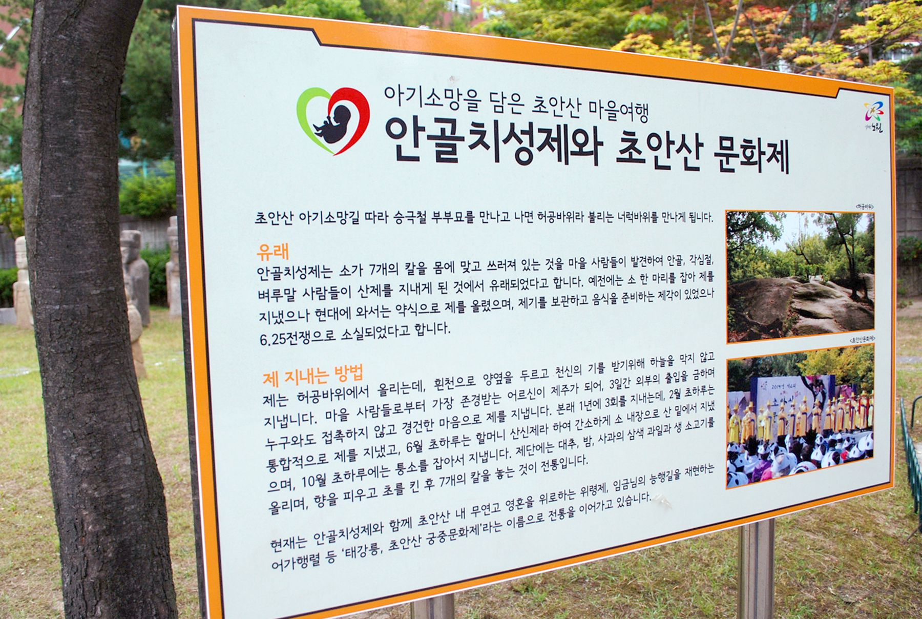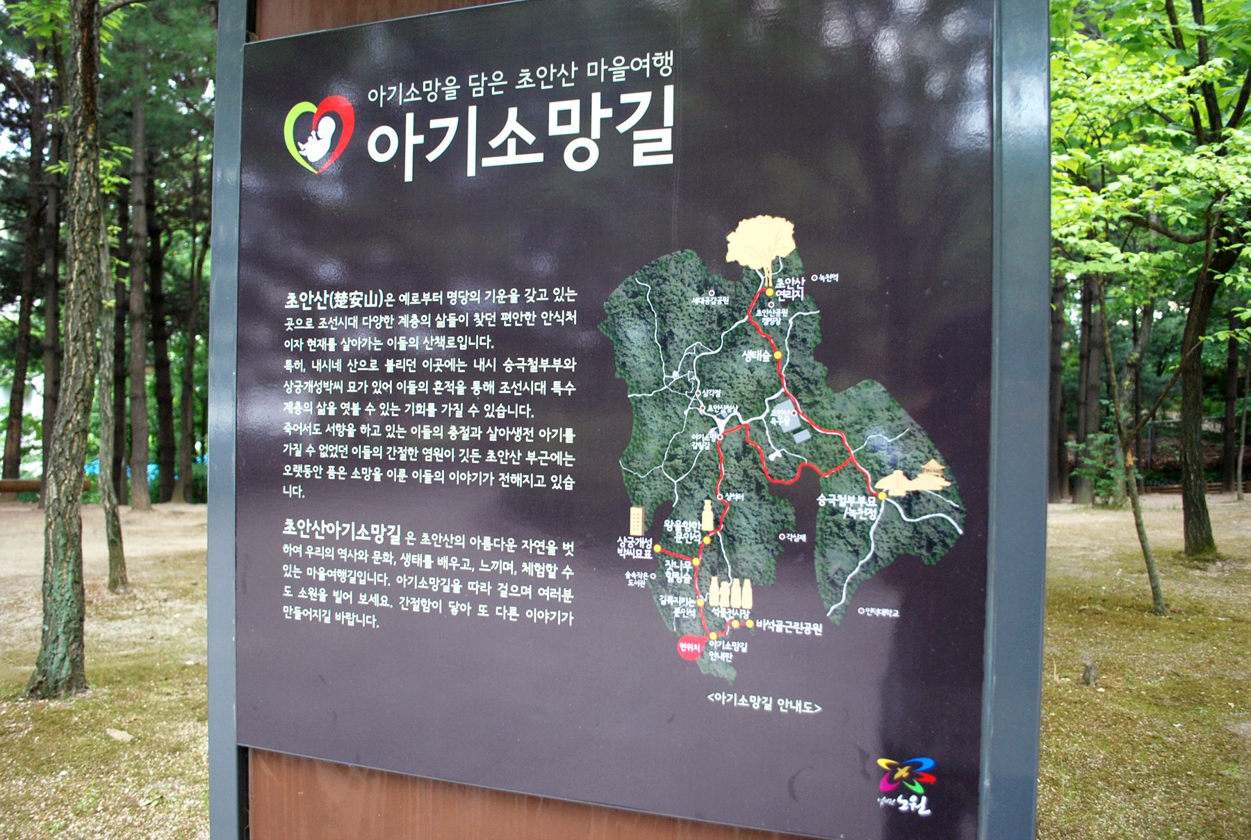 명당의 기운이 있는 초안산은 무덤으로 많이 이용되었으며 내시들이 묻혔기에 자식에 대한 소망도 컸을 것이라 보고 아기소망길을 만들게되었다 합니다.