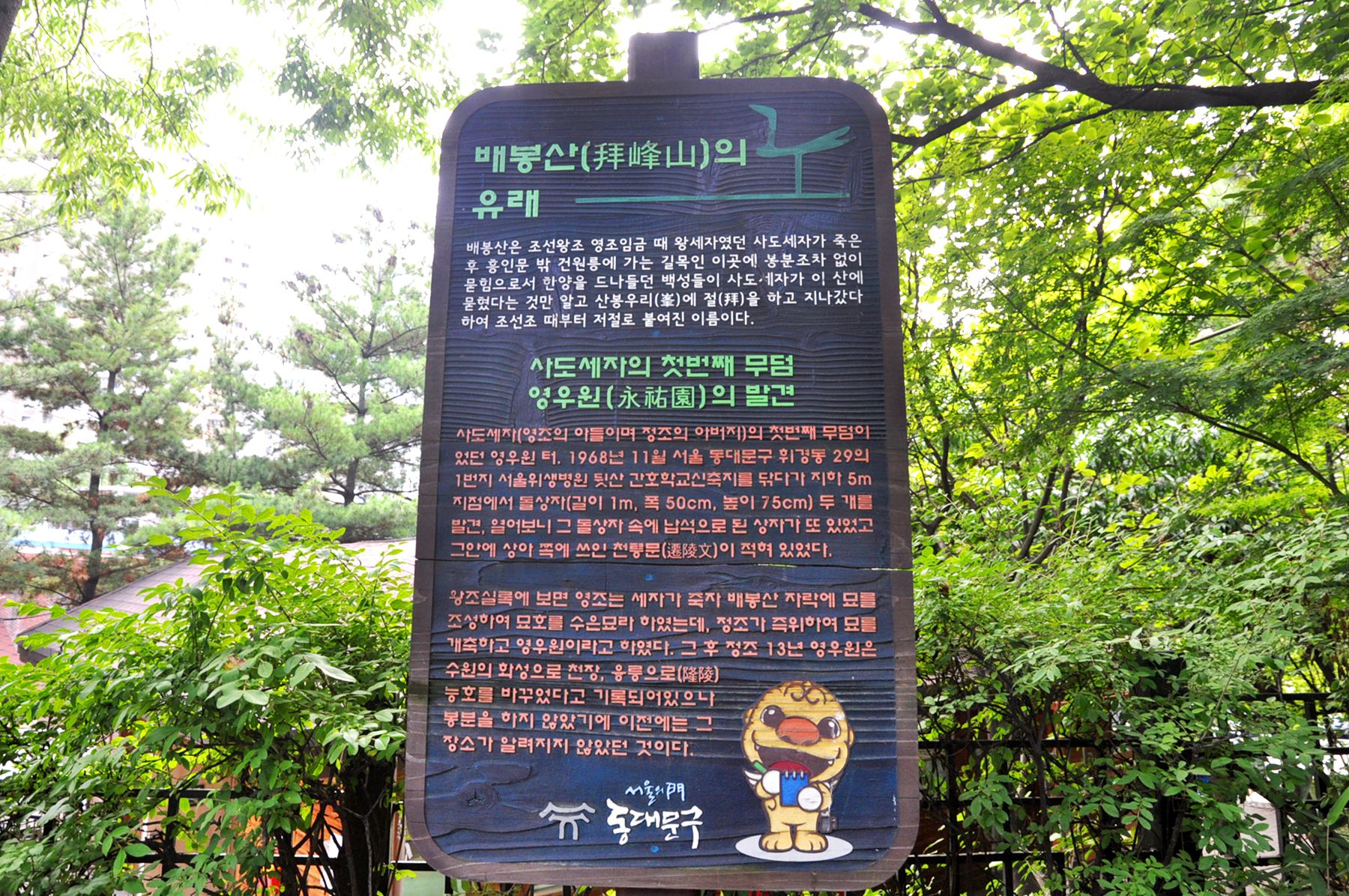 배봉산은 동대문구 전농동에 있는 표고 110m의 산으로 서울시립대학교가 위치해 있으며, 조선시대 영우원과 휘경원 등 왕실 묘원이 마련되어 있었으며 목마장의 울타리가 지났던 곳입니다.