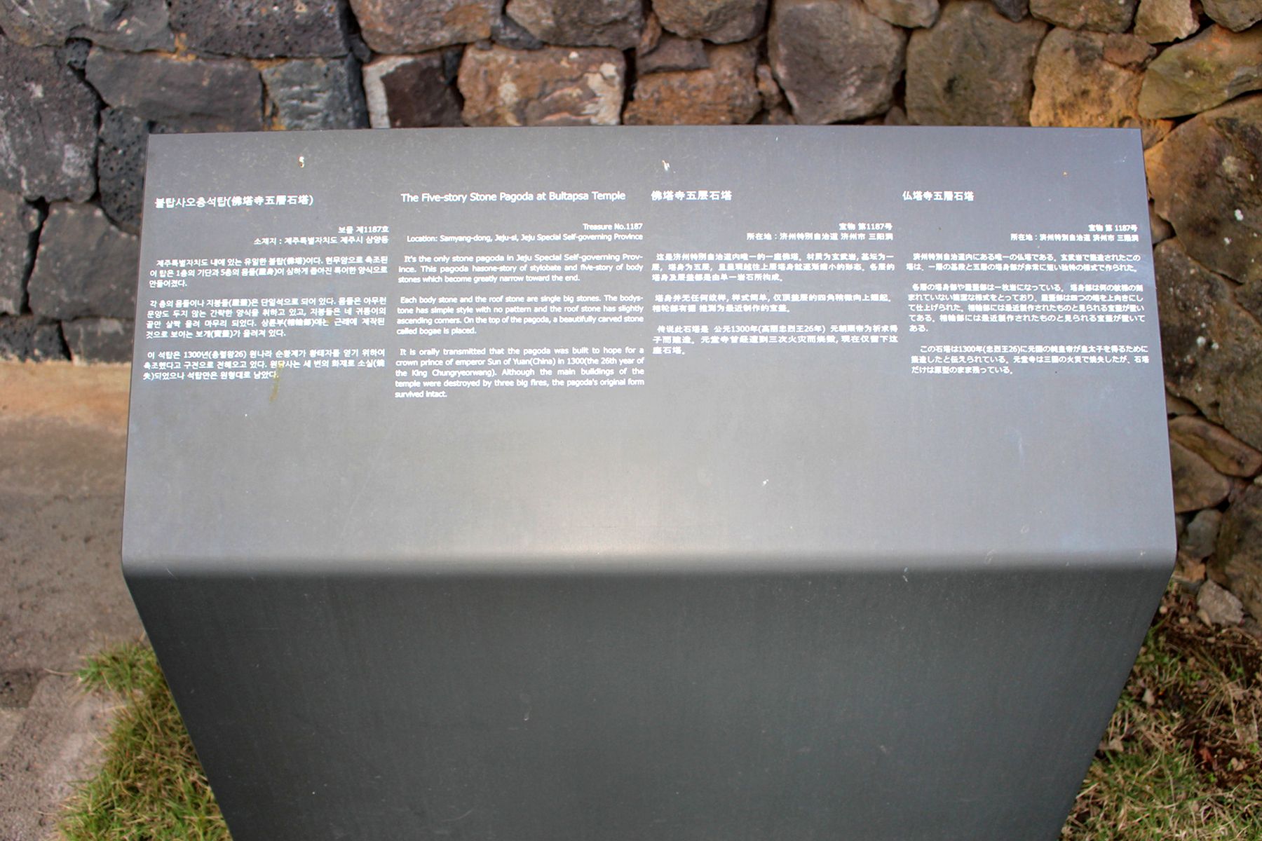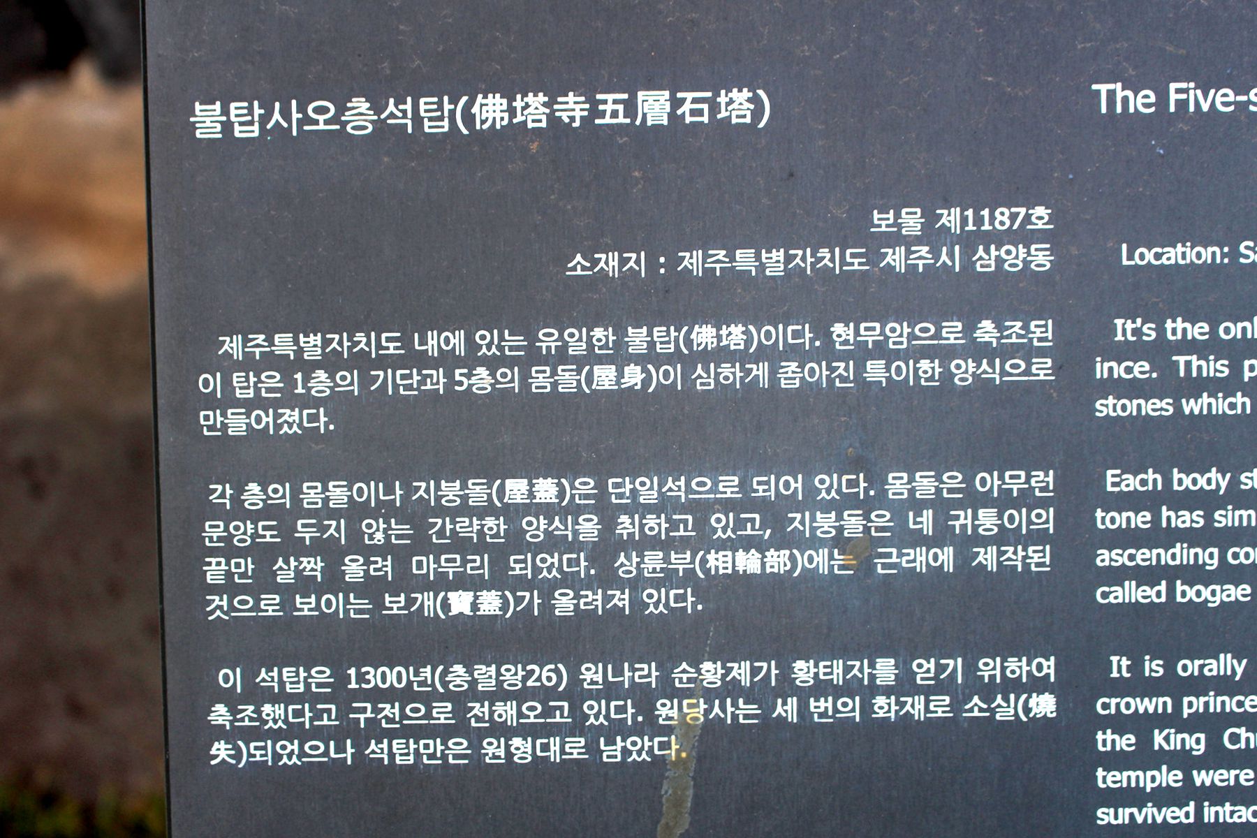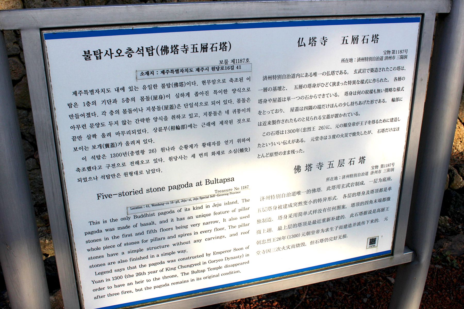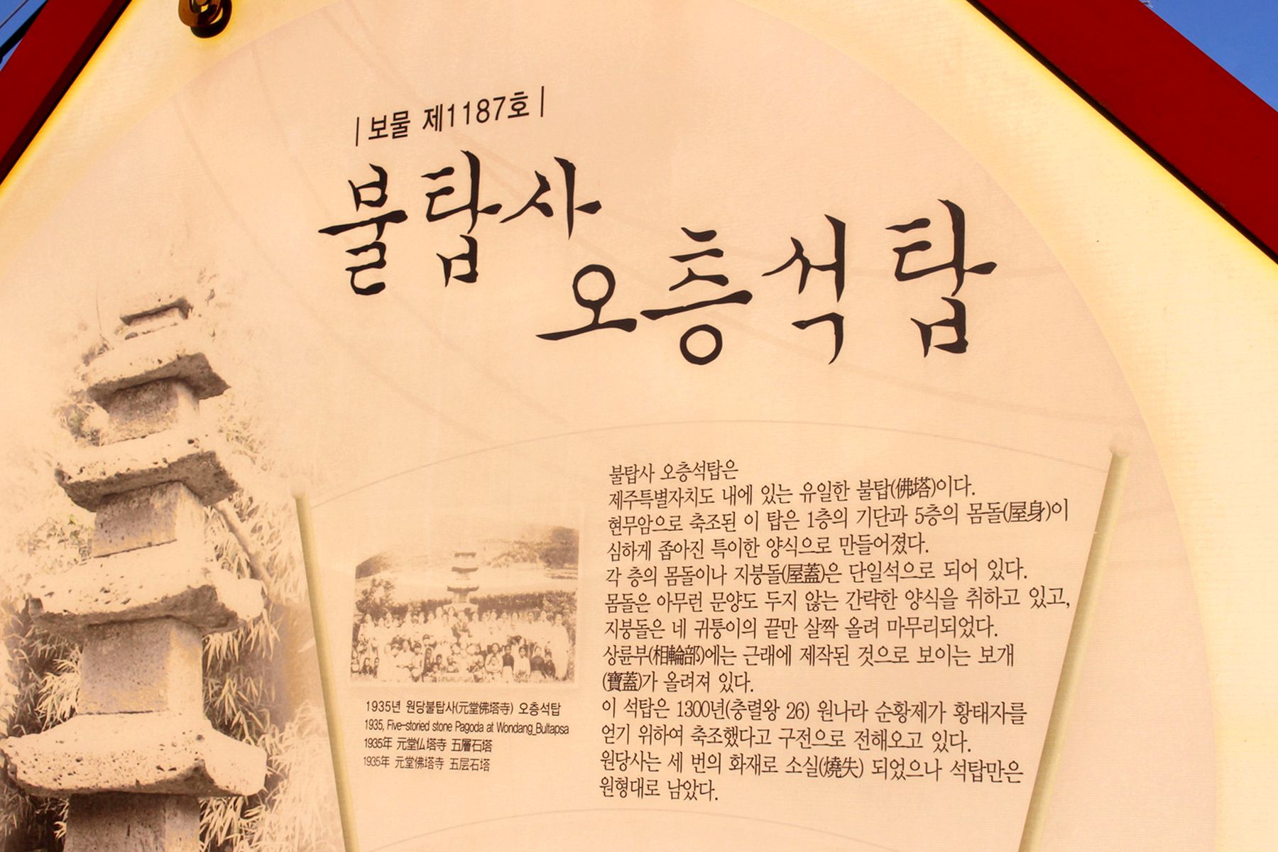 불탑사를 대표하고 있는 건축물중 하나인 불탑사 오층석탑은 제주 유일의 보물로서 보물 제1187로 지정되어 있습니다.