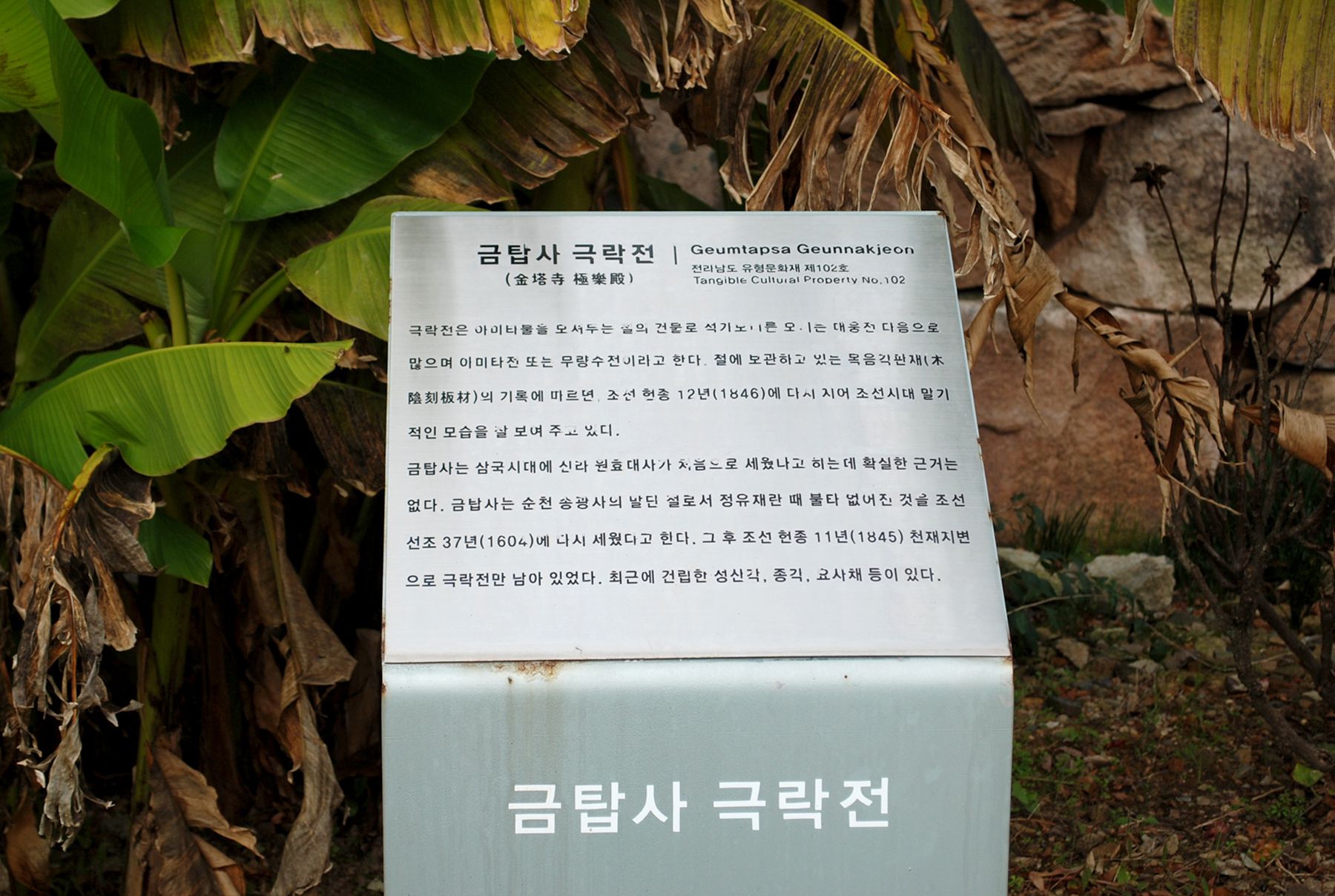 금탑사는 대한불교조계종 제21교구 본사인 송광사의 말사이며 신라 문무왕 때(7세기 말) 원효대사(元曉大師)가 창건한 사찰입니다.