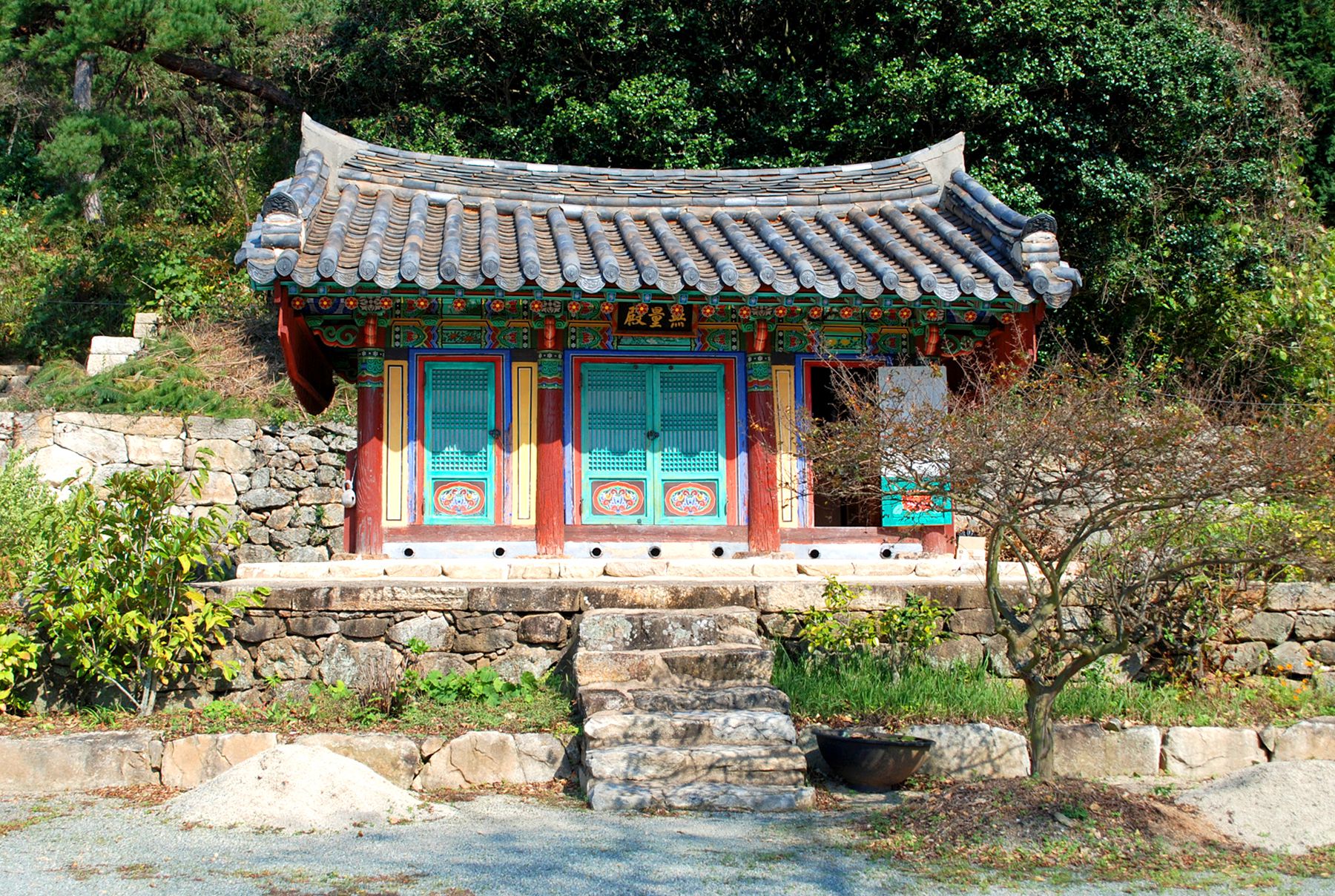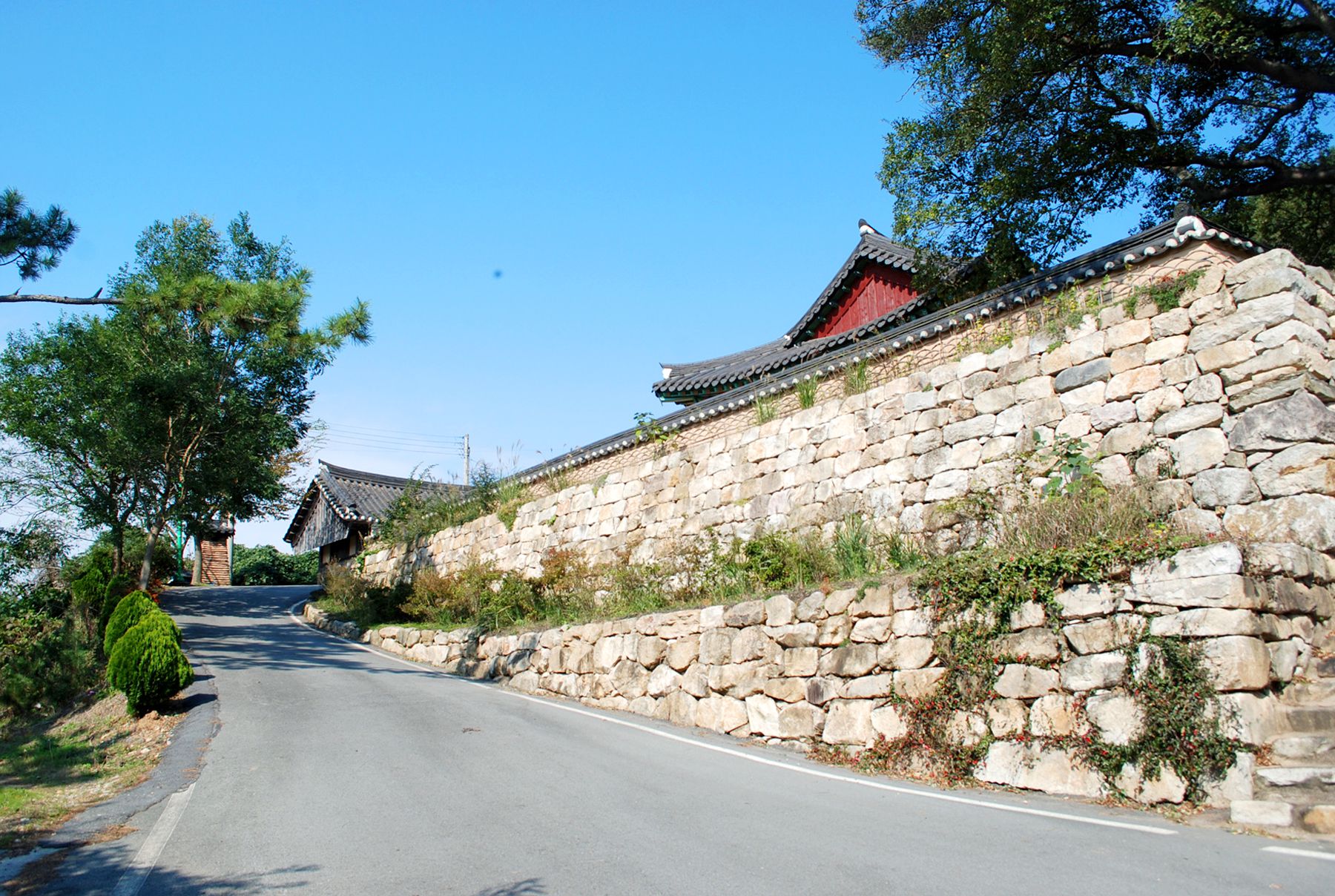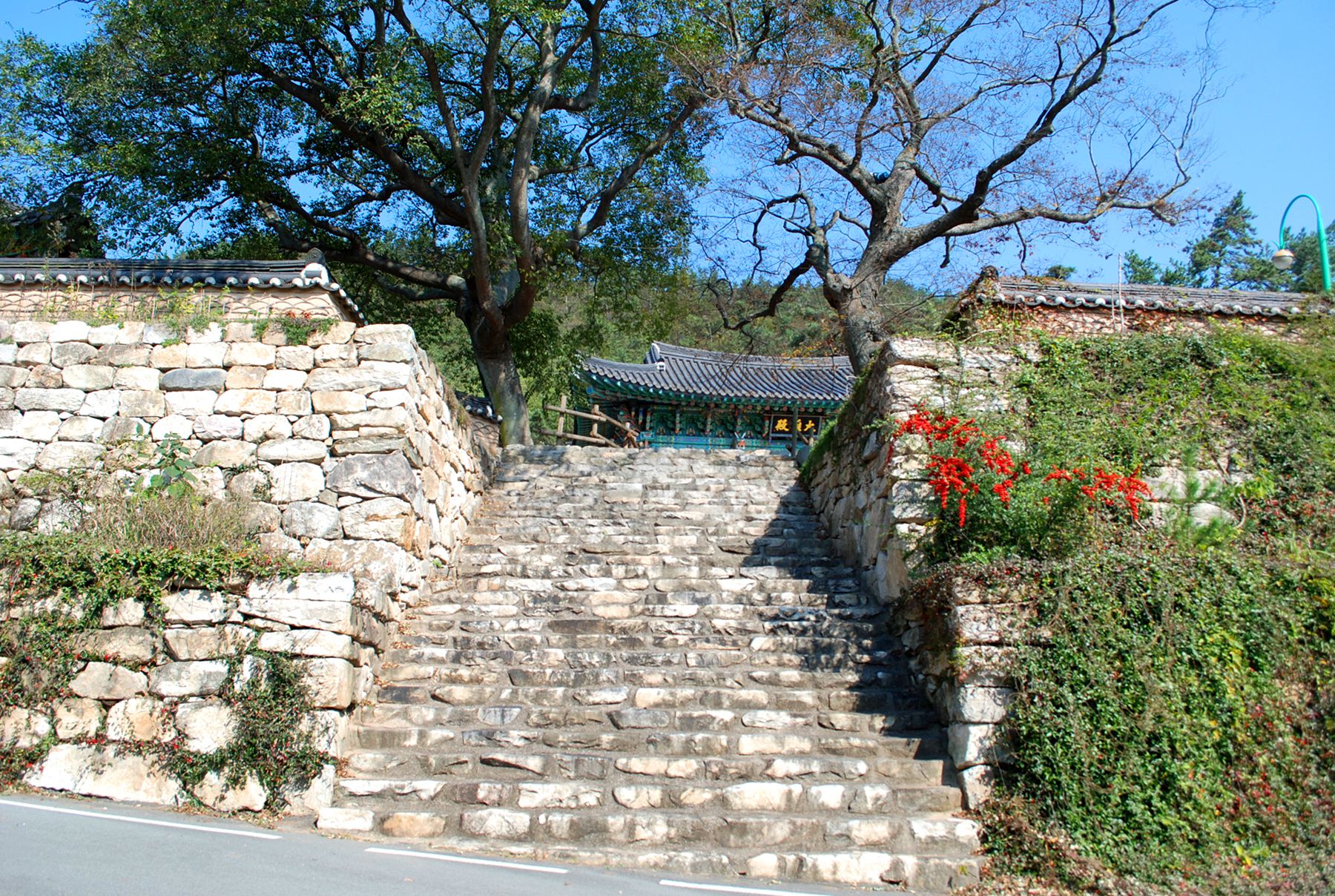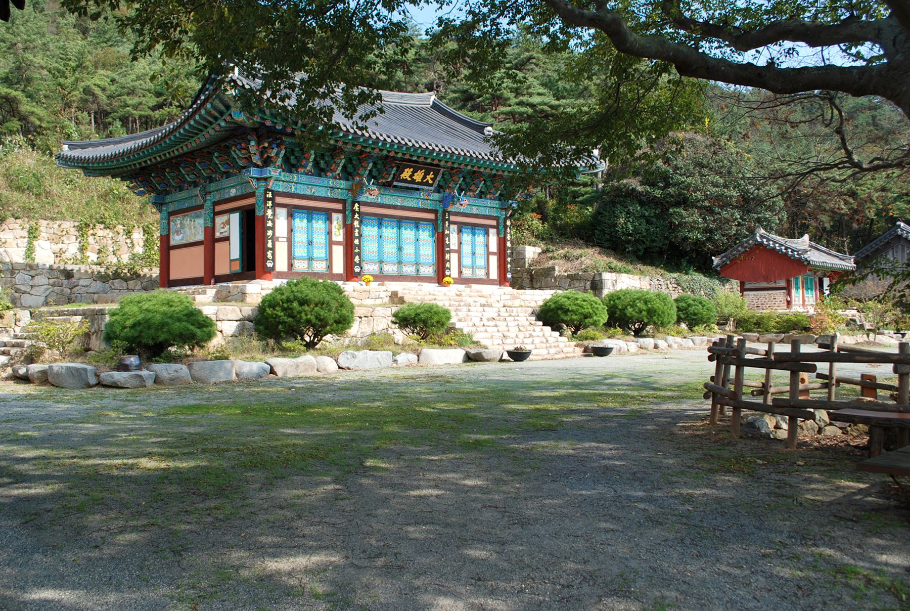 돌담이 성곽처럼 보이는 절의 아늑한 분위기를 느끼며 입구를 지나 절마당으로 들어서면 아름다운 나무와 어우러진 사찰의 모습을 만나볼 수 있습니다.