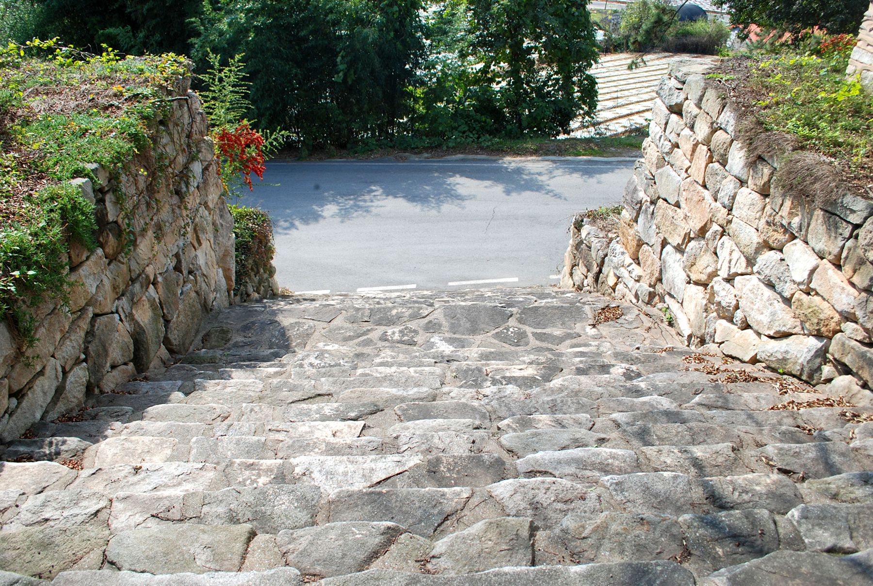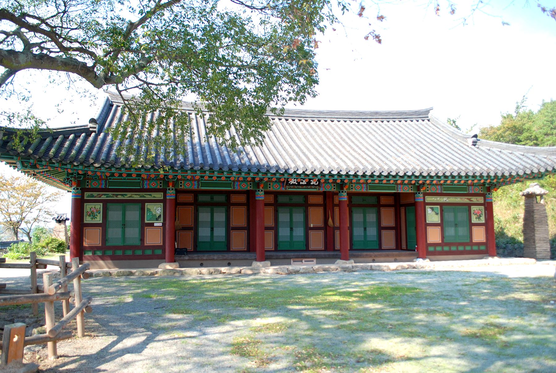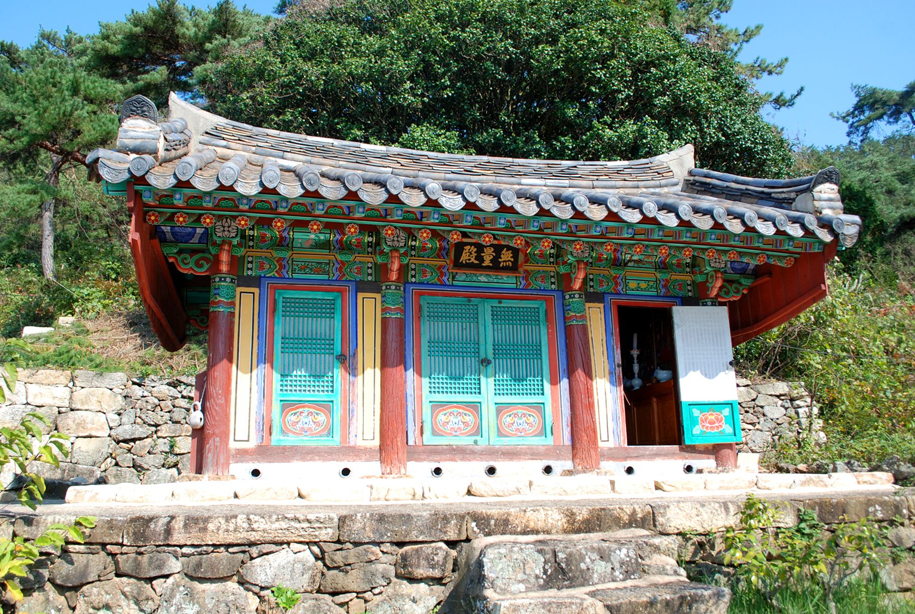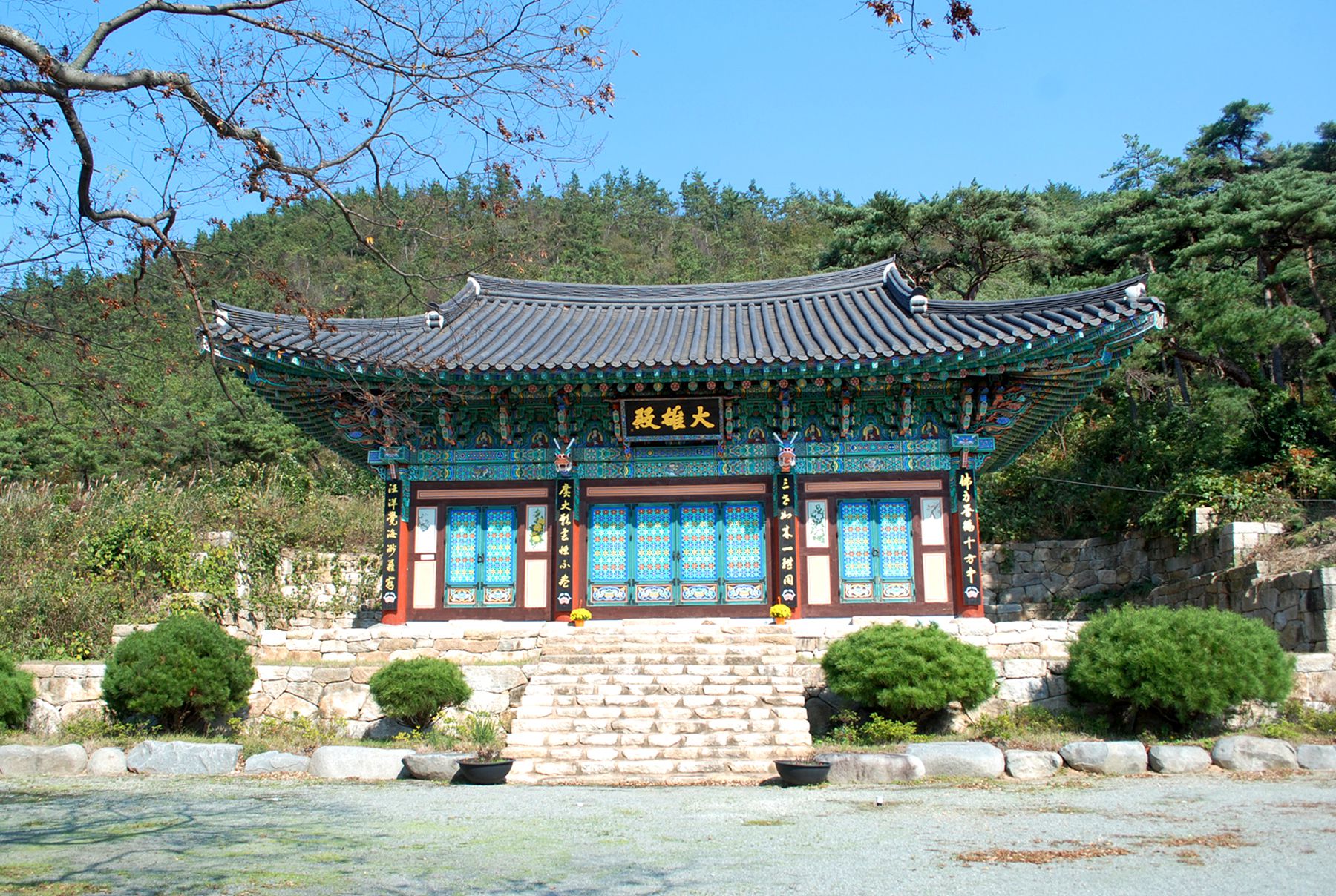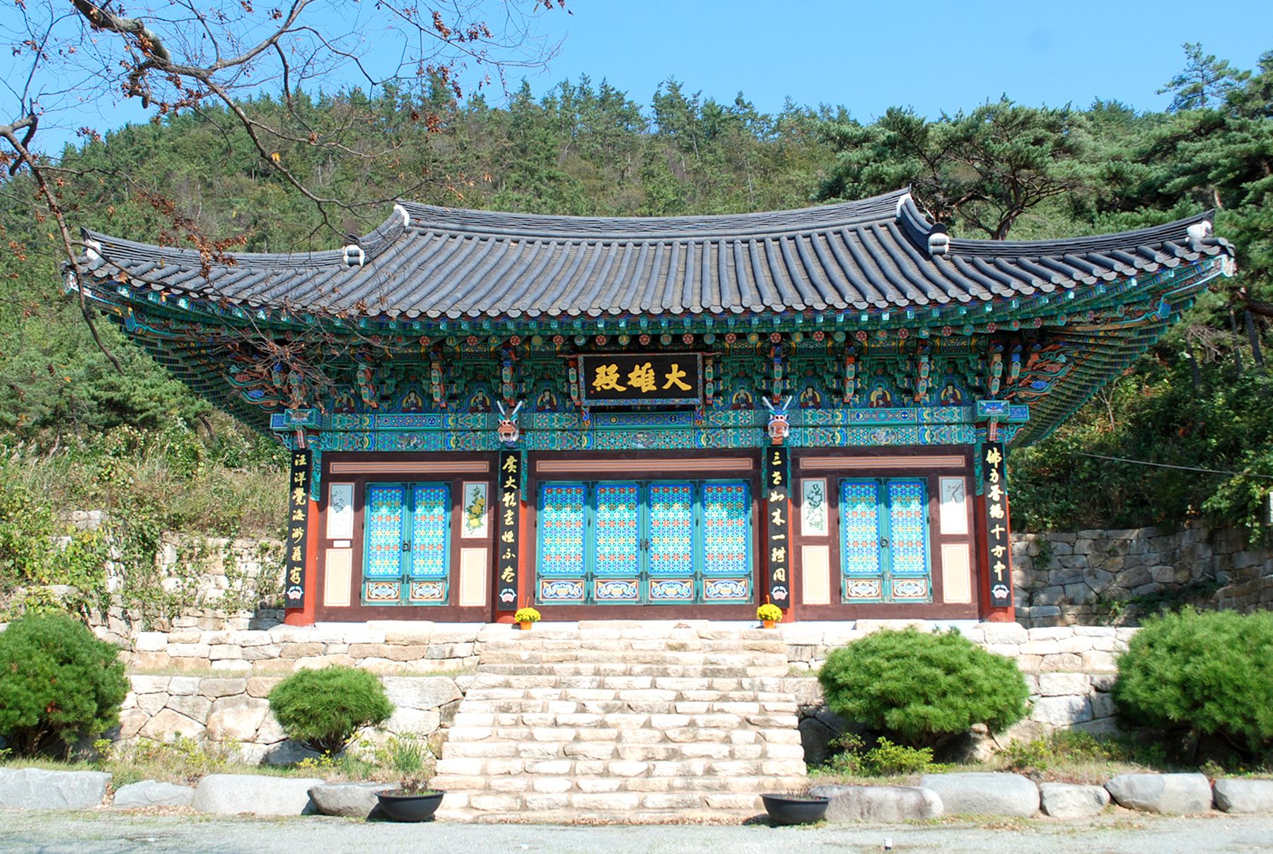 돌담이 성곽처럼 보이는 절의 아늑한 분위기를 느끼며 입구를 지나 절마당으로 들어서면 아름다운 나무와 어우러진 사찰의 모습을 만나볼 수 있습니다.