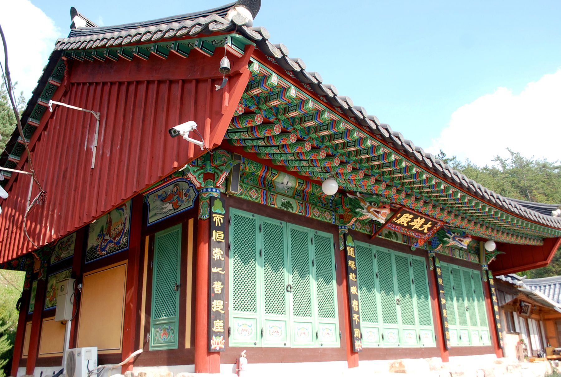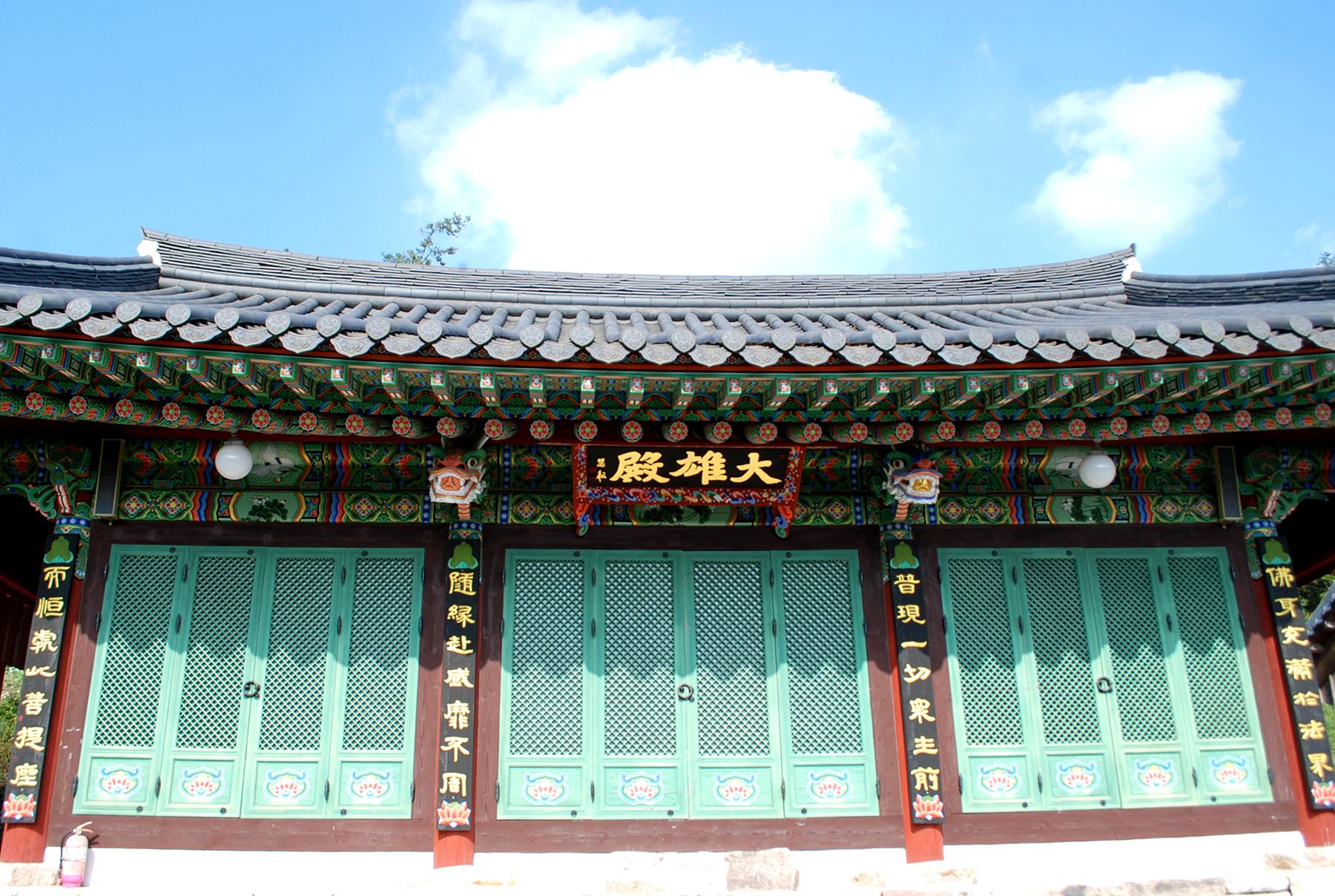 대웅전은 정면 4칸의 팔작지붕집으로 되어있으며 내부 불단에는 삼존불 뒤로 후불탱이 있으며 신중탱과 범종이 모셔져 있습니다.