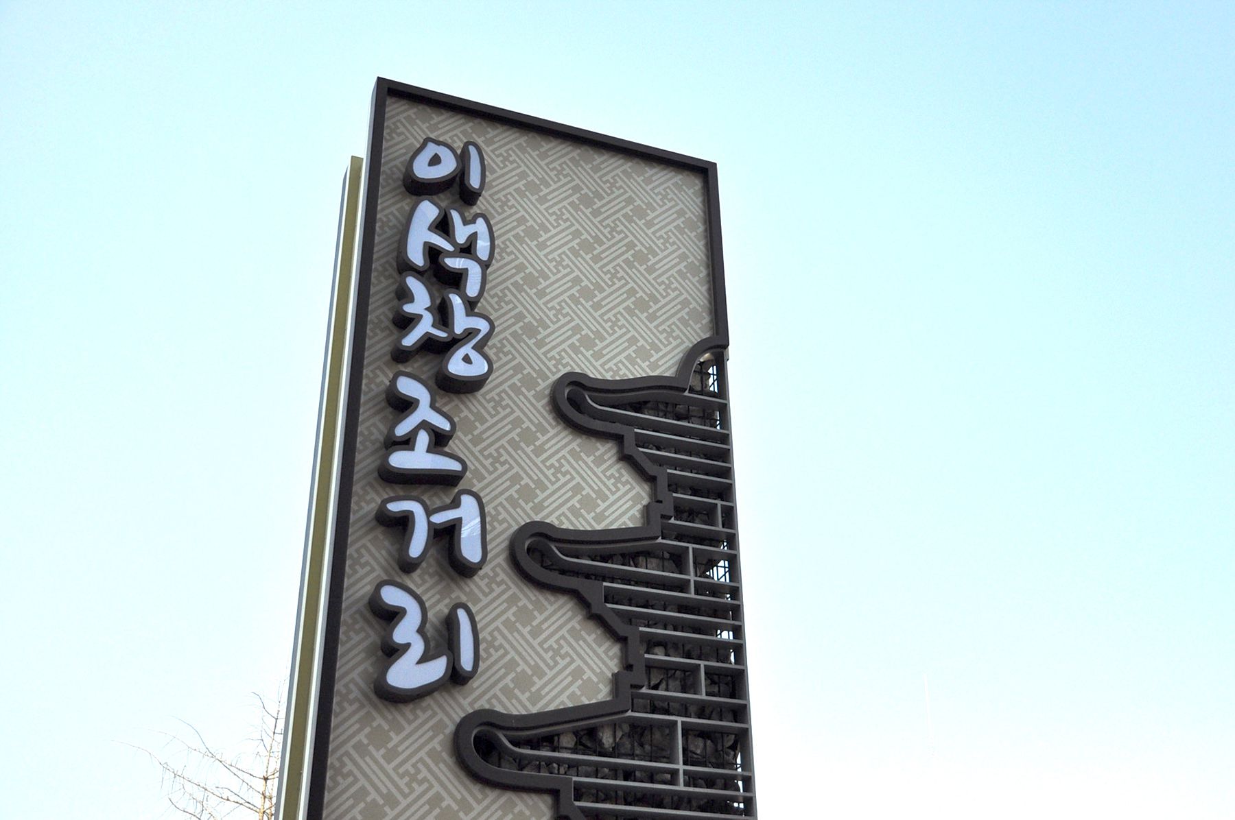간판과 단청기법이 들어가 있는 기둥이 친환경적인 모습과 한국 전통의 멋을 그대로 보여주고 있으며