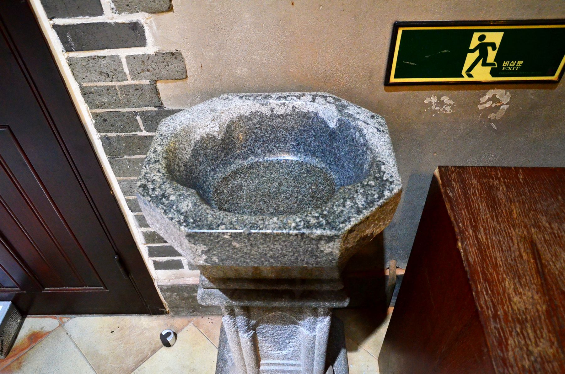바로 밑에 성수대가 있고, 성수를 찍고 하는 기도문이 있습니다.