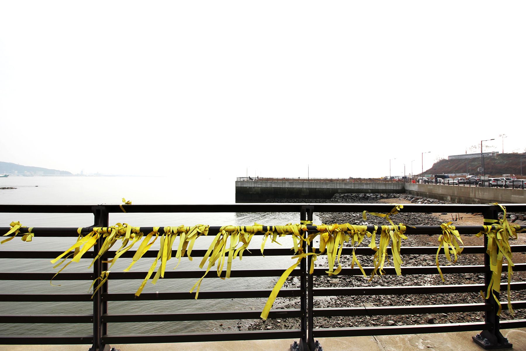벤치앞 펜스에 묶어놓은 노란리본들이 바람에 날리며 먼저 떠나버린 그들의 영환을 위로하는 보입니다.