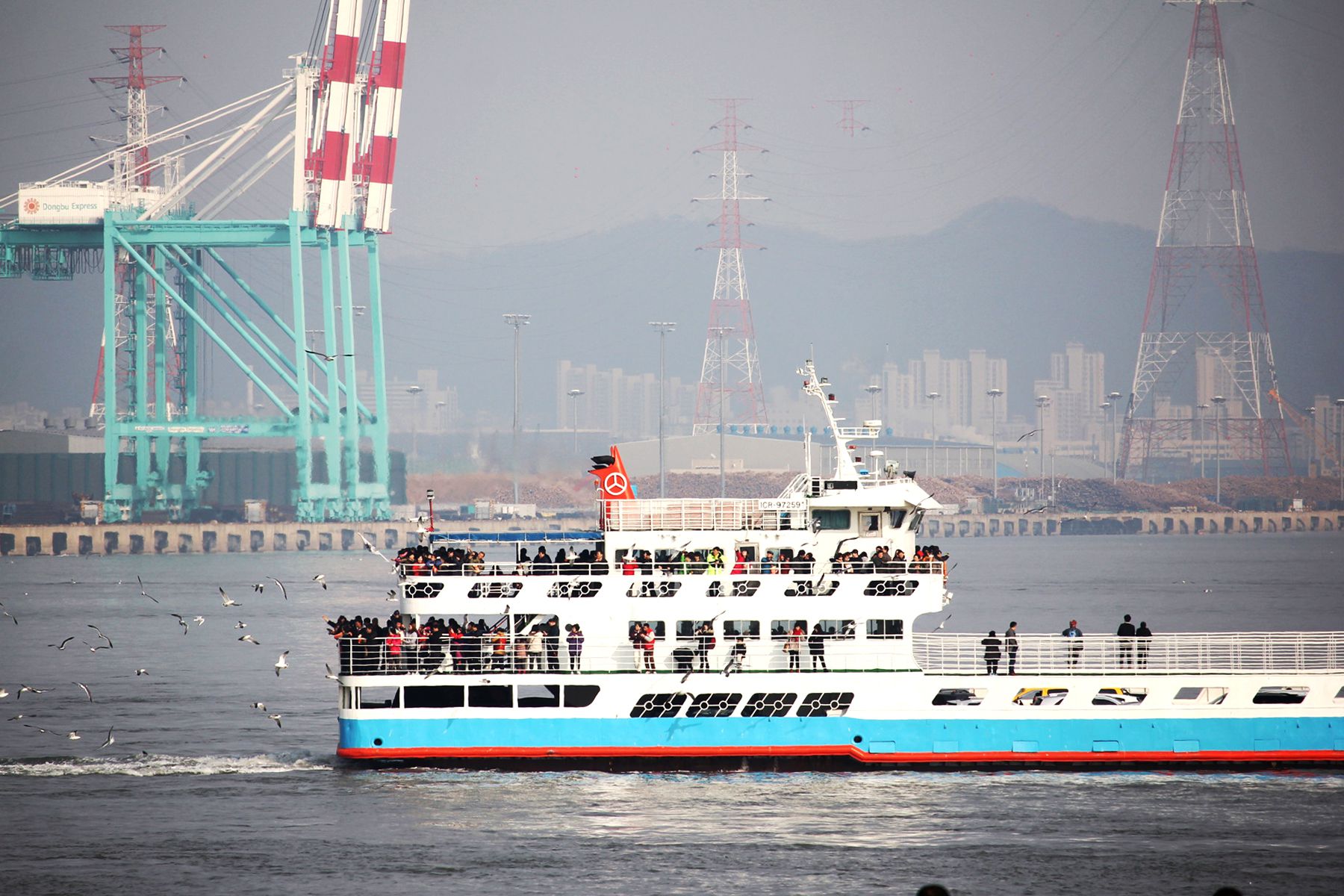 아직도 많은 사람들의 이동수단이 되고 있는 유람선 위에는 사람들이 과자를 들고 갈매기를 부르며