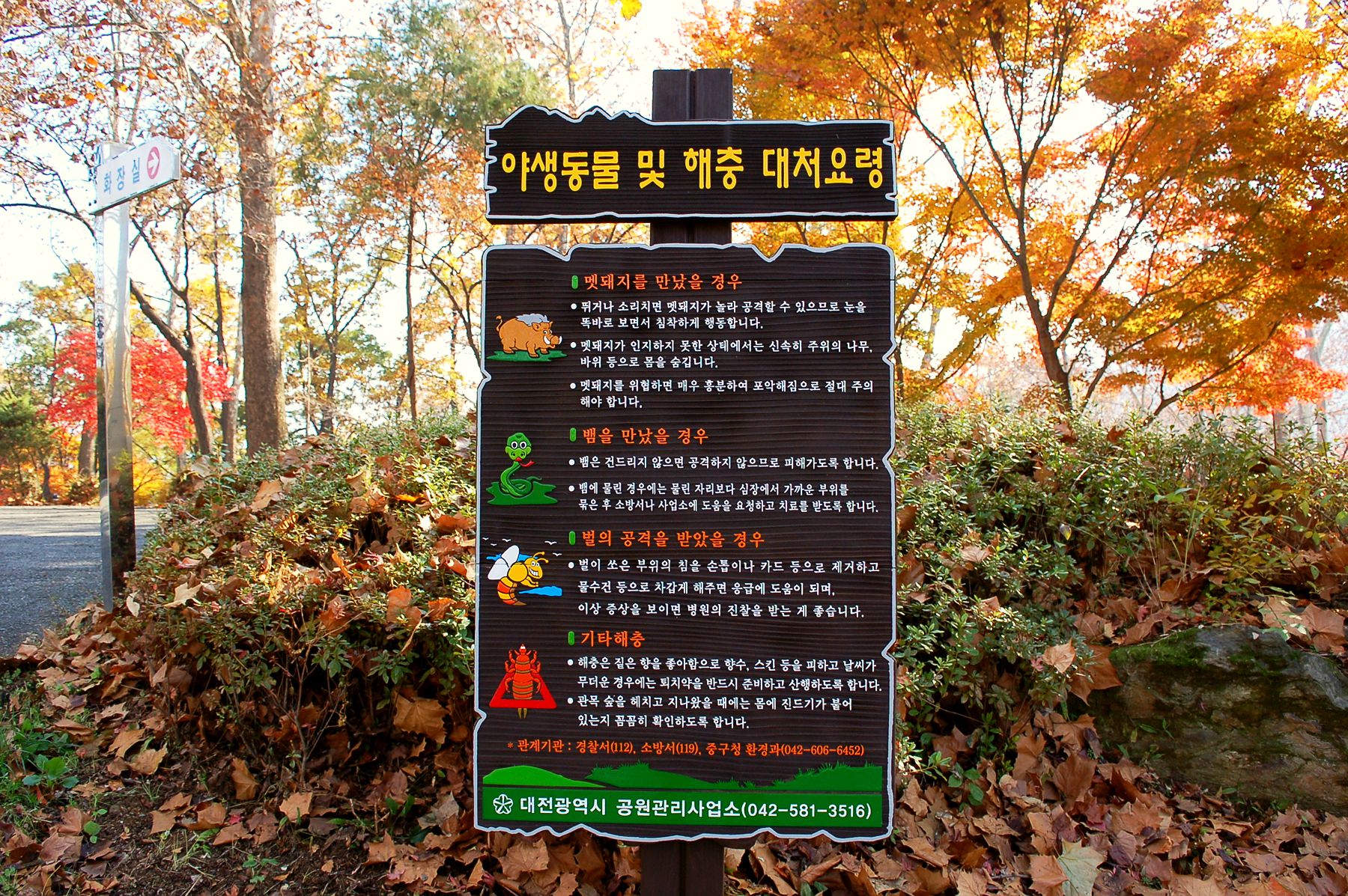 등산객들이 많이 이용하기 때문에 곳곳에 야생동물 및 해충 대처요령이 적힌 팻말이 세워져 있는데요
