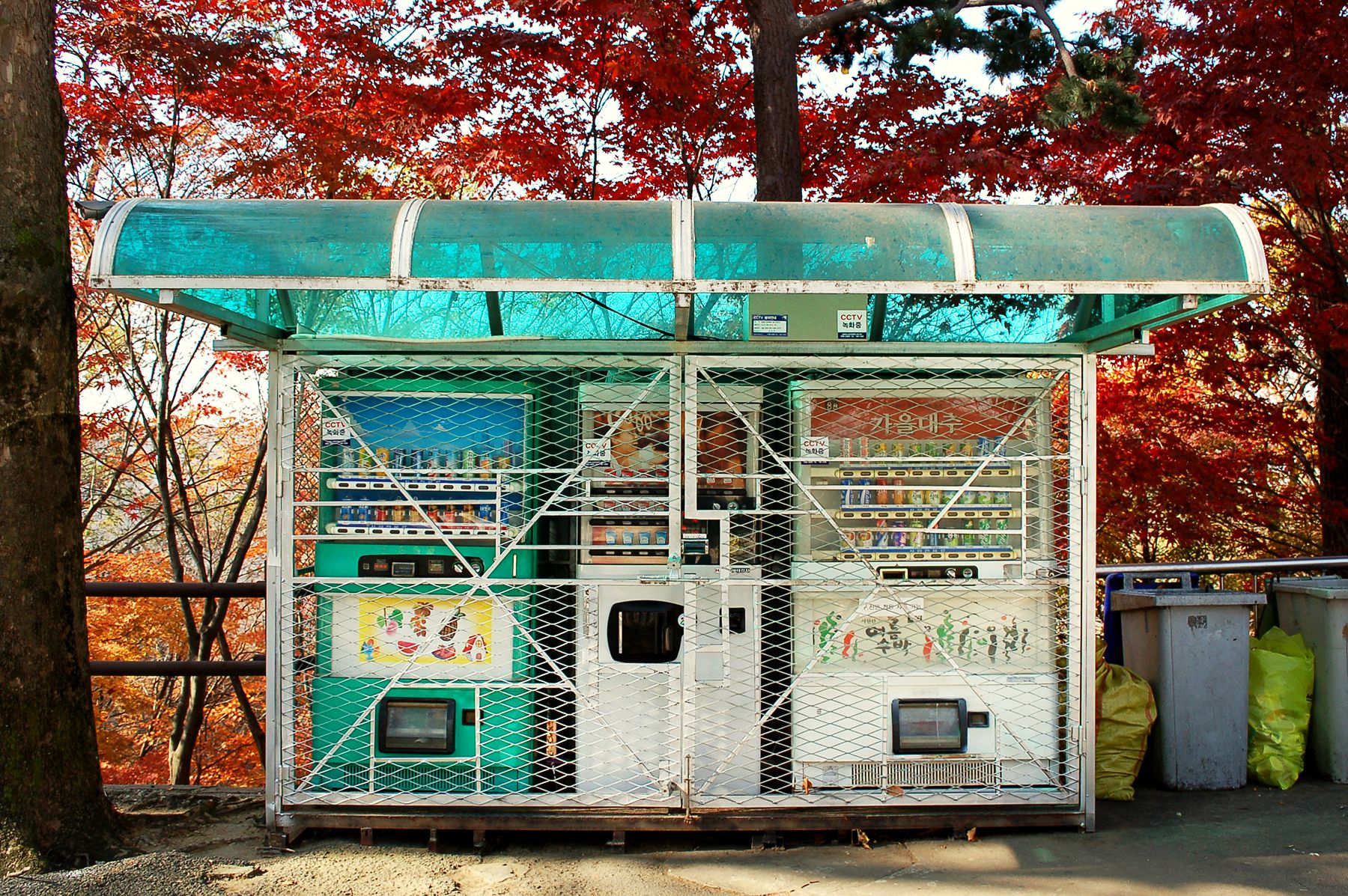 보운대 앞에 여러 종류의 음료수가 들어있는 자판기가 하나 있습니다.