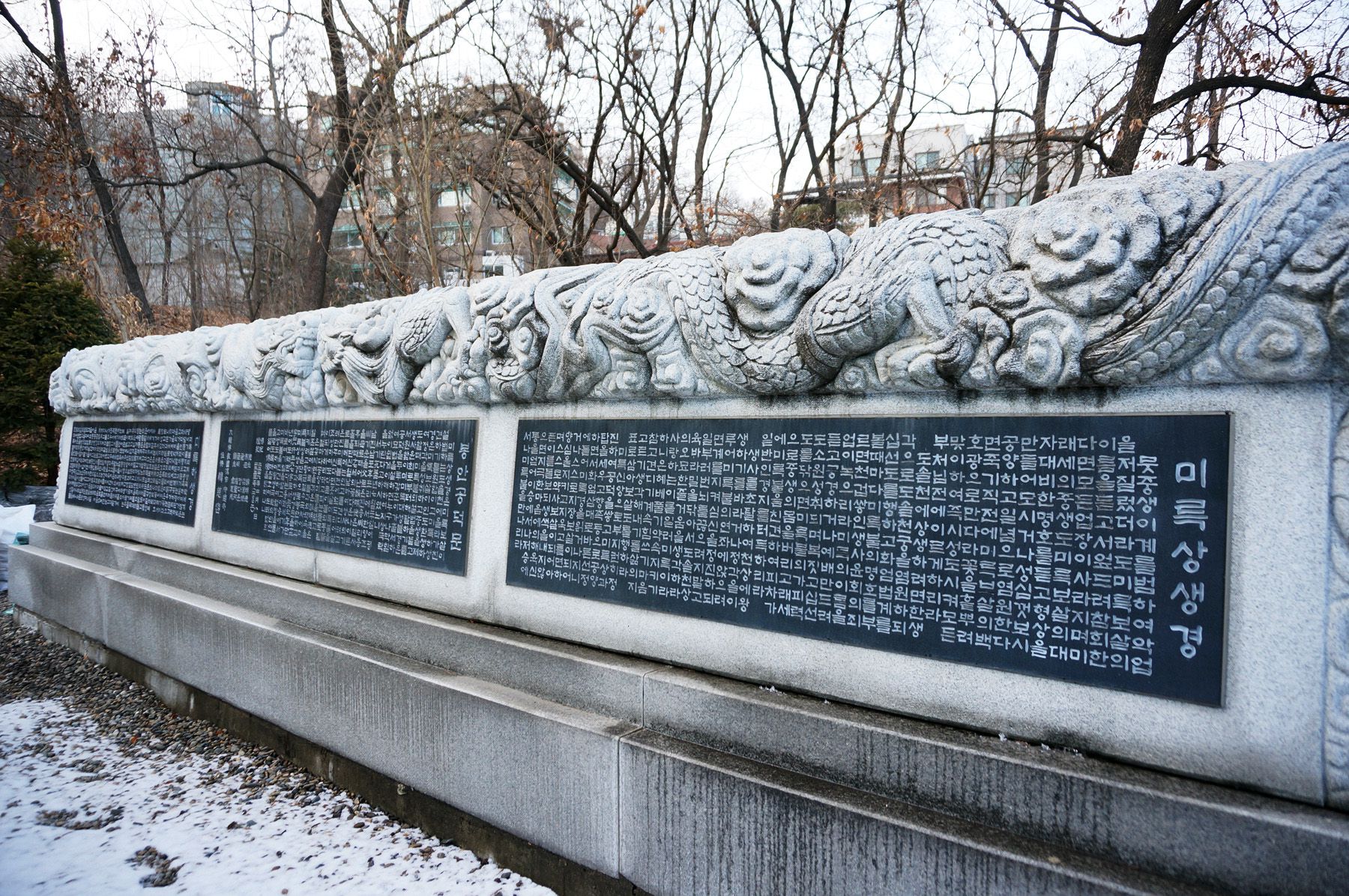 미륵전의 미륵불과 미륵상생경, 봉안공덕문이 길게 새겨진 대형석상이 세워져 있는데요,