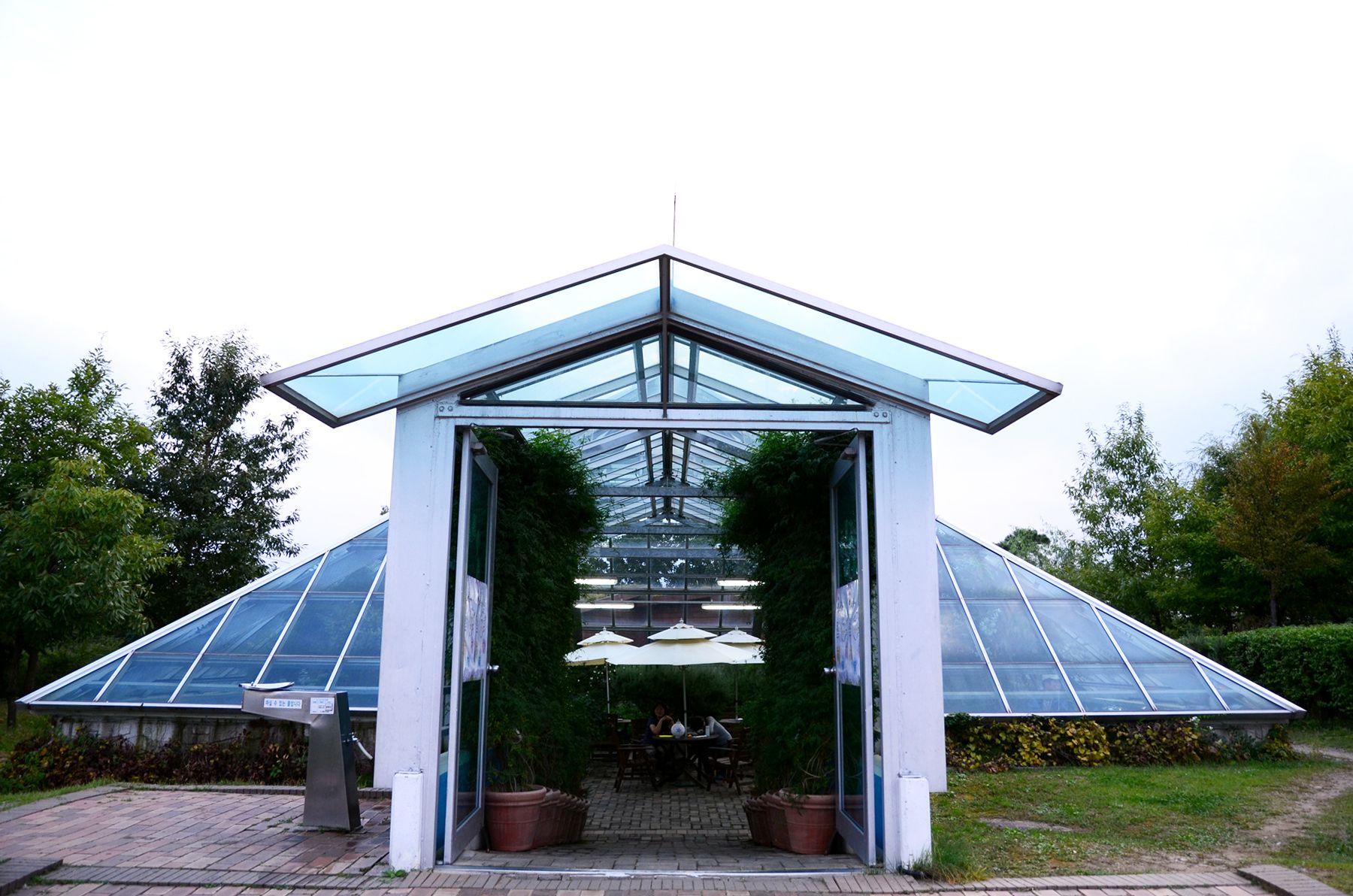 공원 왼쪽에 자리한 피라미드형태의 루브르 박물관처럼 생긴 건물에는