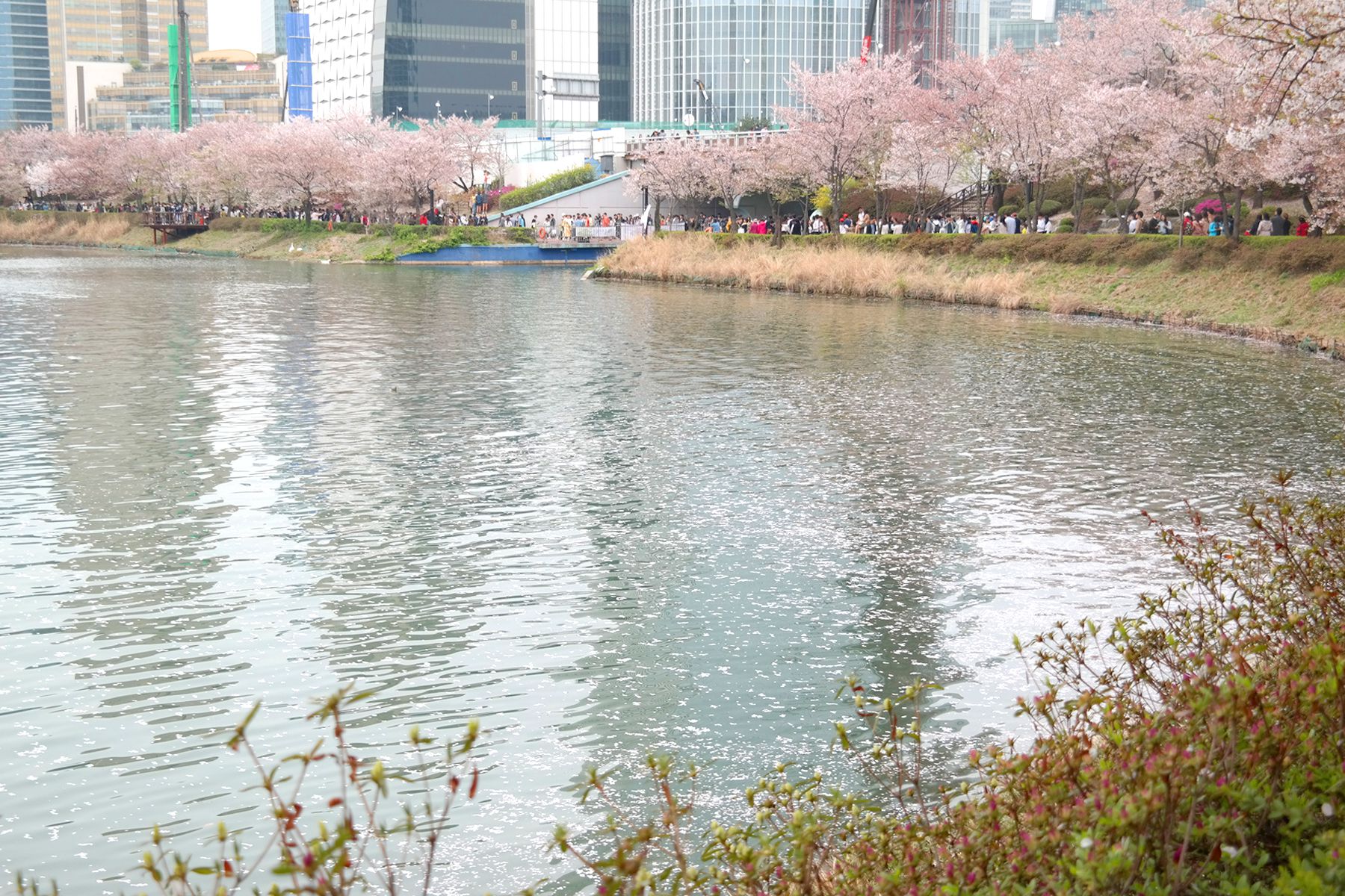 꽃비가 내려 석촌호수에 꽃잎들이 흩날려 떠다니는 모습도 또 하나의 아름다운 광경입니다.