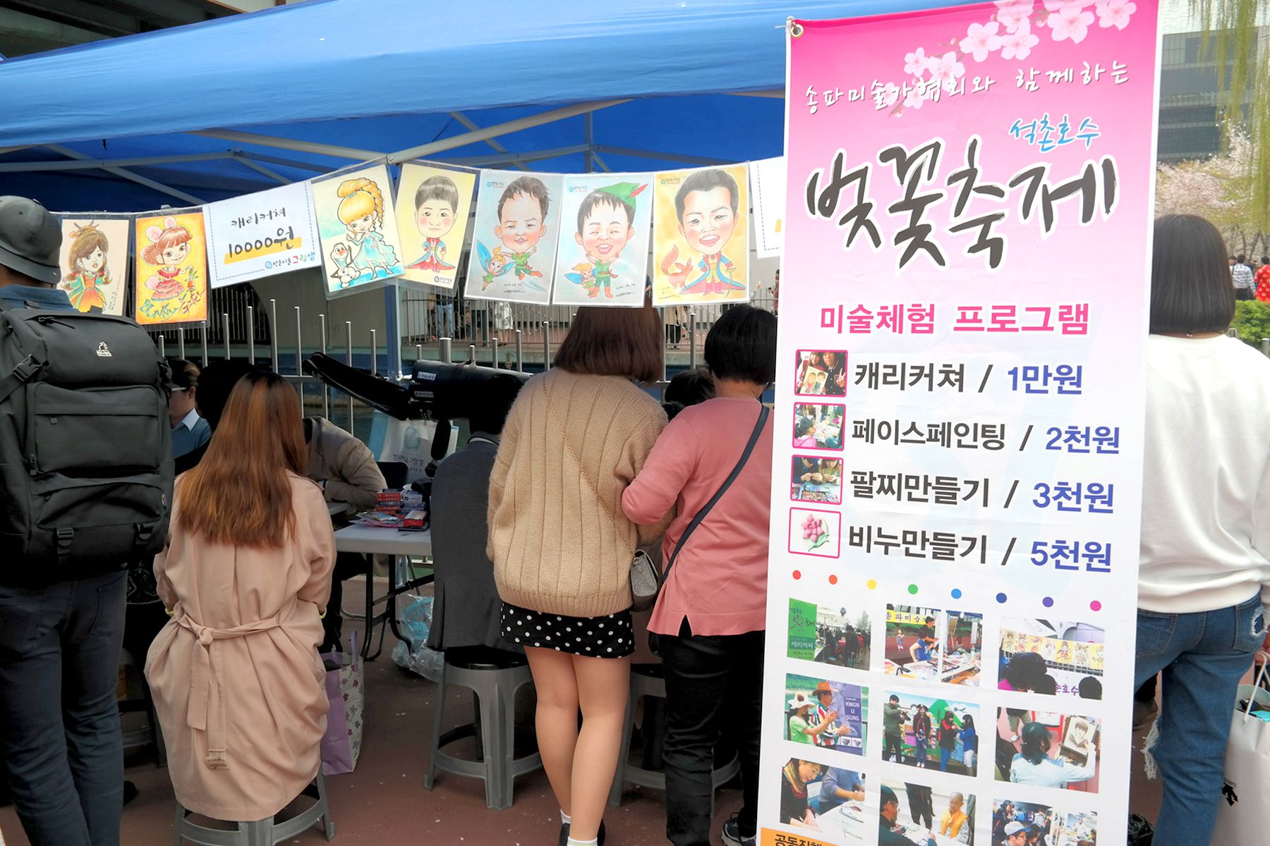 석촌호수의 아름다운 풍경을 감상하며 걷다 보면 캐리커처, 페이스 페인팅 등의 체험 프로그램을 만나볼 수 있습니다.