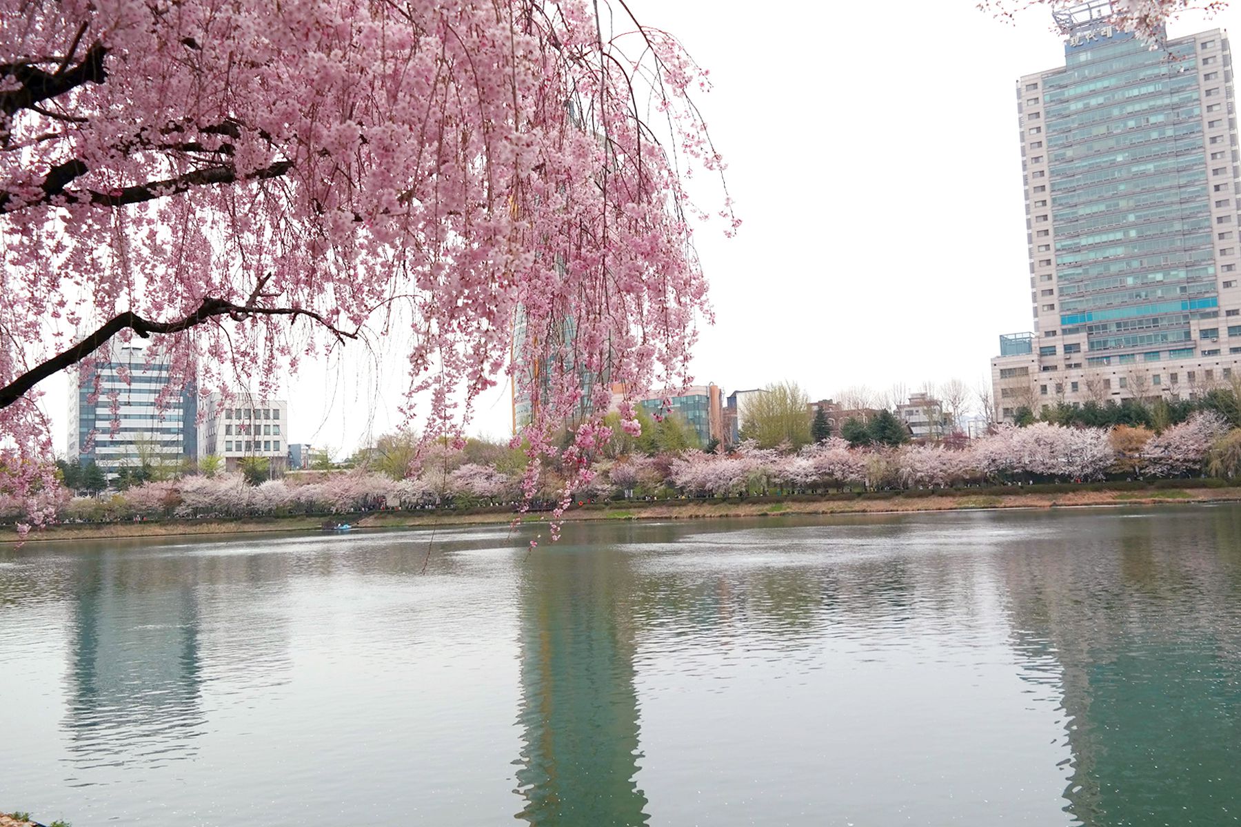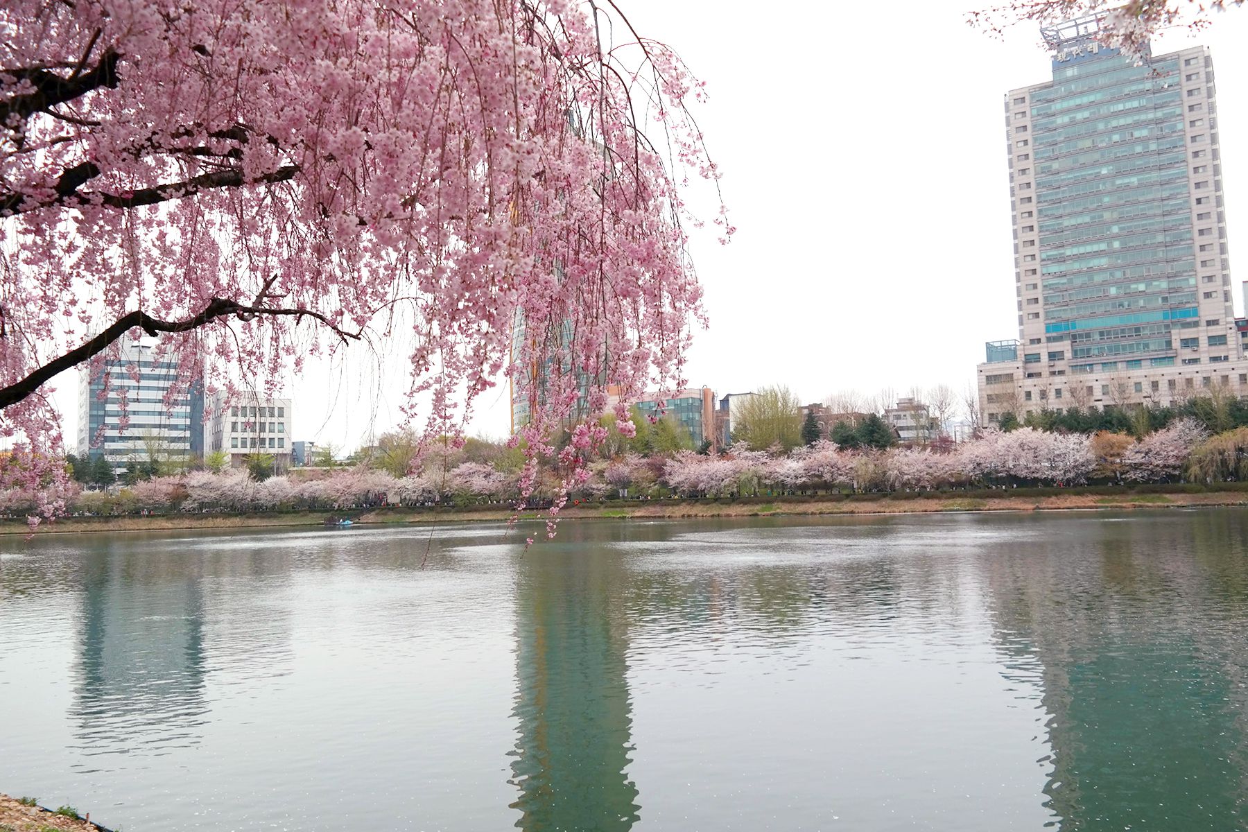핑크빛 벚꽃이 만개한 벚나무들이 호수를 에워싸고 있는 모습이 참 아름답습니다.